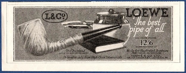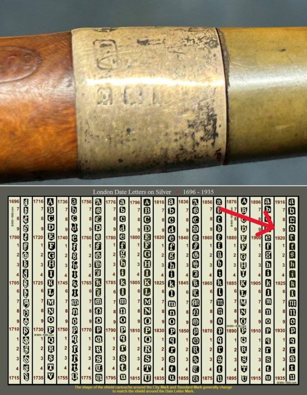 Charles Lamb famously described his friend, Samuel Taylor Coleridge, as ‘an archangel a little damaged’ – and that is how I feel about this extraordinary, sterling-silver banded Loewe & Co. billiard. Just by looking at the pipe, you can tell that it comes from a bygone era. There is an elegance and subtlety to this pipe which makes it somewhat angelic – but it is more than a century old and bears the damage of a life well-lived. This is something of a grail pipe for me and, despite the wounds, I am delighted to have found it. Before we refresh our memories about the quasi-mythical Loewe & Co., let’s have a look at the marks on the pipe itself. On the left side of the shank is engraved the encircled logo of the company: L&Co. On the right side of the shank is engraved the words Loewe [over] London.W. On the underside of the shank is engraved the word Derby – the model name of this pipe, indicating it to be a billiard. We move on to the sterling-silver band. It also shows the encircled logo of the company: L&Co. In addition, it shows the letters A·D inside a rectangle. Finally, it also has a set of hallmarks which were nigh-on impossible to decipher at the start – but I did decipher some of them later in the restoration. But no need to jump ahead – I will tell you now that the hallmarks are a gothic letter ‘D’, then a somewhat-obscured lion passant, and the third is too faint to make out – but it is likely to be a leopard’s head. Naturally, L&Co. is an abbreviation of Loewe & Co. of London. The letters A·D on the silver refer to Auguste Dreyfus, whose company, Dreyfus & Co., had assay offices in London and Chester in England. The gothic letter ‘D’ corresponds to the year 1919 (as you can see in the chart below). The lion passant indicates that this is sterling silver (id est, 92.5% silver). And, assuming that the final mark is, actually, a leopard’s head, it would indicate that the object is from London. Let us examine some of the details of Loewe’s history. Pipedia provides a surprisingly long entry on Loewe’s and I heartily encourage you to read it here. However, it is worth quoting a few lines (emphasis mine):