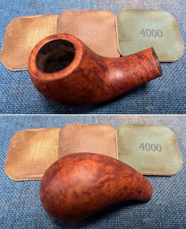 Now it was my turn to work on the pipe. I sanded the bowl and rim top with 320-3500 grit 2 inch sanding pads. I wiped the bowl down with a damp cloth to remove the sanding debris.