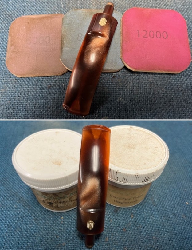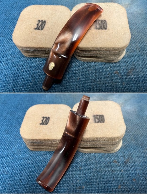 I sanded the stem with 320-3500 grit sanding pads to blend in the tooth chatter and marks. I wiped the stem down after each pad with an Obsidian Oil saturated cloth to remove the grime and protect the stem.
