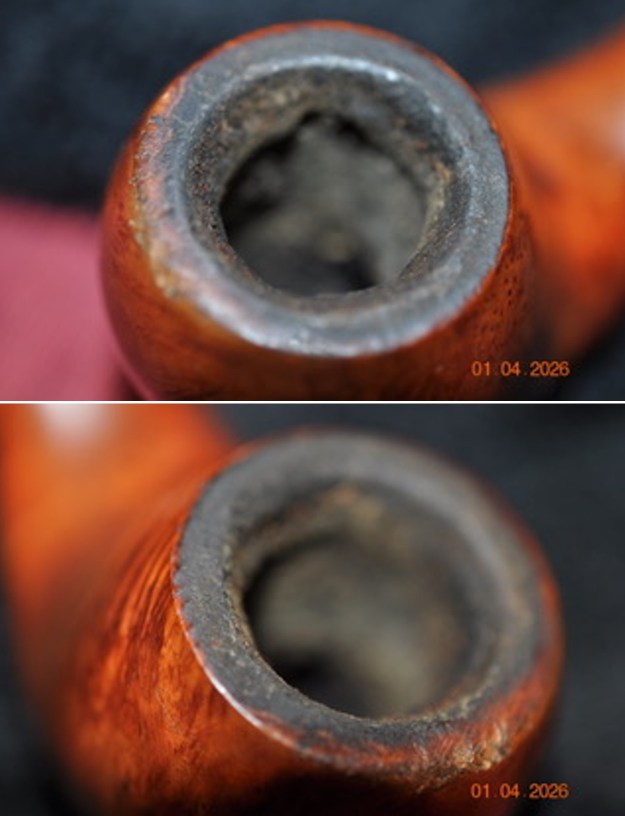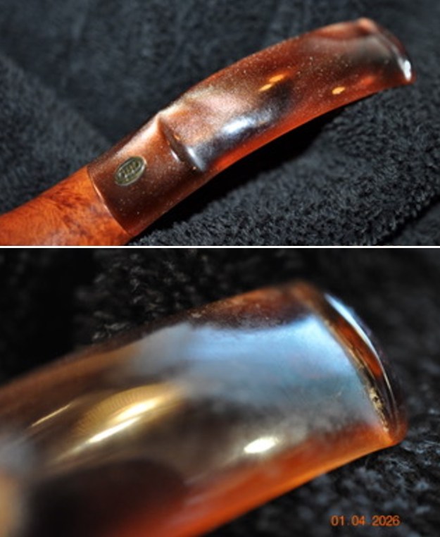 Jeff took a photo of the bowl and rim top to show the condition of the pipe. There was a thick cake in the bowl and a build up of lava on the smooth rim top. It is also built up on the inner edge of the bowl. The stem photos show the grime and the tooth marks on both sides ahead of the button.