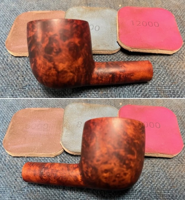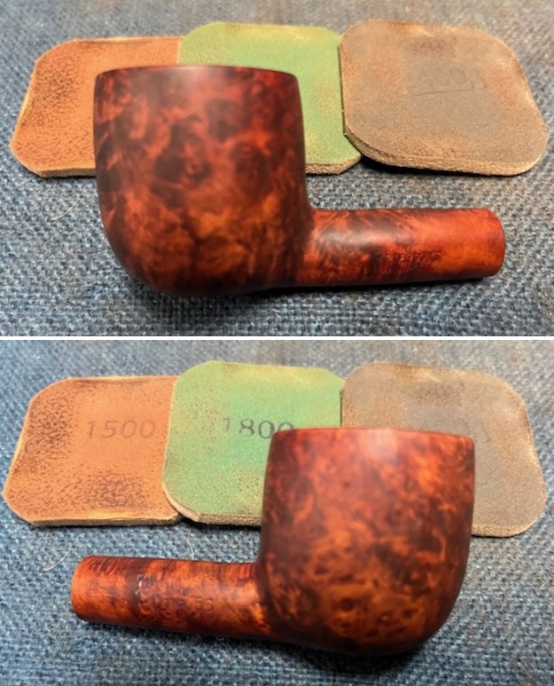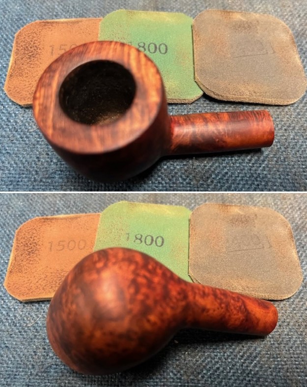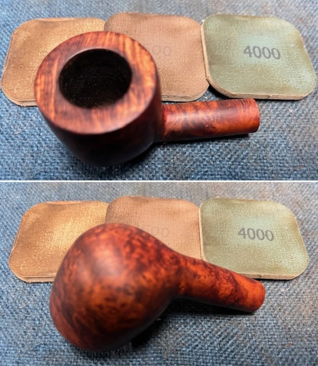 I sanded the bowl and shank with 320-3550 grit 2×2 inch sanding pads to smooth out the scratches and darkening on the rim top and sides of the bowl. I wiped the bowl down after each sanding pad with a damp cloth to remove the sanding debris.