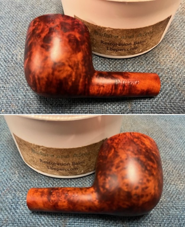 I worked some Before & After Restoration Balm into the briar with my finger tips. I let it sit on the bowl and shank for 10 minutes and then buffed it off with a paper towel and soft cloth. The product is a great addition to the restoration work. It enlivens, enriches and protects the briar while giving it a deep glow. It is a product I use on every pipe I restore.