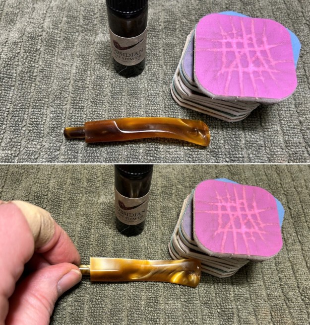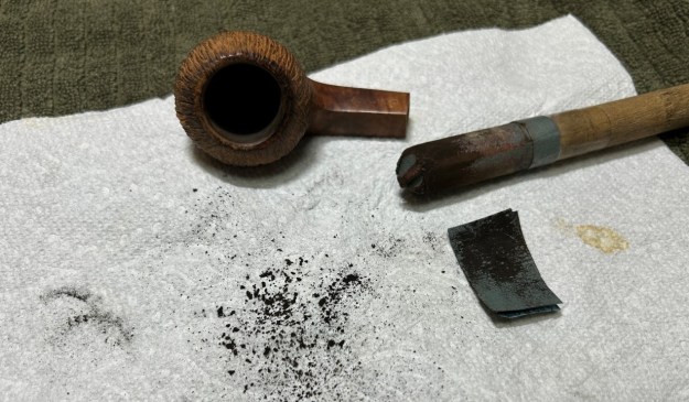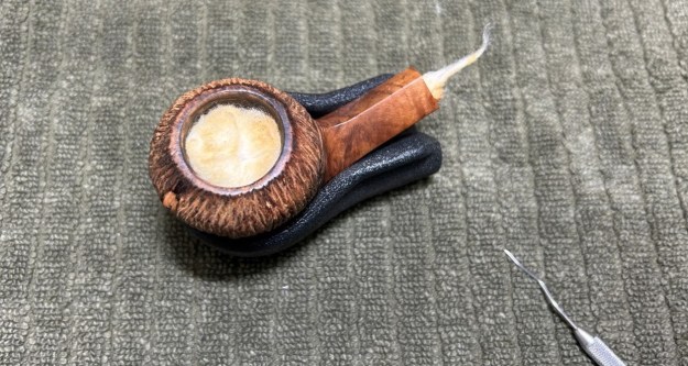 Edward’s pipes were originally produced in Saint-Claude, France when Francais [sic] actually was a world-class pipe maker with longstanding business & political connections to Colonial Algeria that allowed them to obtain the finest briar. During the tumultuous 1960’s, Edward’s created a business model to offer the finest briar available in both Classic and Freehand shapes – all at a fair price. They bought the company & equipment and cornered the market on the finest, choice Algerian Briar just before the supply vanished in political turmoil of Algeria’s independence. Edward’s packed up both machinery and briar-treasure to America, safely caching the essentials to create a new pipe-making dynasty. This was a coup, for the 70’s and 80’s were grim years for pipe smokers as quality briar all but disappeared. Edward’s Design Philosophy is hard to pin down, think of their style as the “American Charatan” with unique & clever twists all their own. Today, they fashion pipes in several locations across the USA. All of Edward’s pipes are Algerian Briar – a fact very few pipe companies can claim, and all are oil-cured utilizing natural finishes – no strange concoctions are used to interfere in your tastebud’s dance with the briar. Algerian, Calabrian, Sardinian, Corsican – take your pick, but Algerian Briar is generally considered the finest smoking briar ever used. When combined with oil-curing, Algerian takes on a magical quality that even Alfred Dunhill recognized as far back as 1918 as the choice for both his Bruyere and Shell.How about the condition? The stummel is in very good condition – the pipe was well maintained. There is a bit of cake in the bowl and lava on the rim, but truly not that much. There is a noticeable fill on the front of the bowl, but I am happy to leave that as it is. The stem is a bit trickier. It’s dirty – although no more than average. However, the previous owner must have been a clencher. There are some serious chomp marks in this stem, but I can resolve that. I used isopropyl alcohol on a few cotton rounds and wiped down the stem to provide an initial cleaning of filth before moving on to the next steps. The primary cleaning came next. I disinfected the inside of the stem with both pipe cleaners and cotton swabs dipped in lemon-infused 99% isopropyl alcohol. I scrubbed thoroughly to make sure the interior was very clean. However, I also used some tube brushes and cream cleanser to really scrub the insides. That helped! Since this stem was made of acrylic, there’s no oxidation and I can skip those steps and go right to repair. I set about fixing the marks and dents in the acrylic – of which there were quite a few. This was done by filling those divots with clear cyanoacrylate adhesive. I left this to cure and moved on.The penultimate step for the stem is sanding. First, with my set of needle files, I reduced the bulk of the cyanoacrylate repairs. I removed the excess adhesive as near to the surface as possible, without cutting into the acrylic. Following that, I used all nine of the micromesh sanding pads (1,500 through 12,000 grit) to sand out flaws, even out the acrylic, and provide gentle polishing of the finished surface. I also applied pipe-stem oil while using the last five micromesh pads. There was a wonderful shine on the stem when I was done.As the stem was (nearly) complete, I moved on to the stummel. The first step was to ream out the bowl – that is to say, remove all the cake inside the bowl. This accomplished a couple of things. First (and most obviously), it cleaned the bowl and provided a refurbished chamber for future smoking. Second, when the old cake was removed, I could inspect the interior walls of the bowl and determine if there was damage or not. This pipe was quite clean and needed very little reaming. I used a pipe knife and a piece of sandpaper taped to a wooden dowel. Collectively, these ensured that all the debris was removed.My next step was to remove the lava on the rim. For this, I took a piece of machine steel and gently scraped the lava away. The metal’s edge is sharp enough to remove what I need, but not so sharp that it damages the rim.