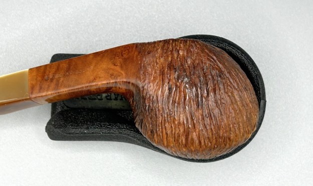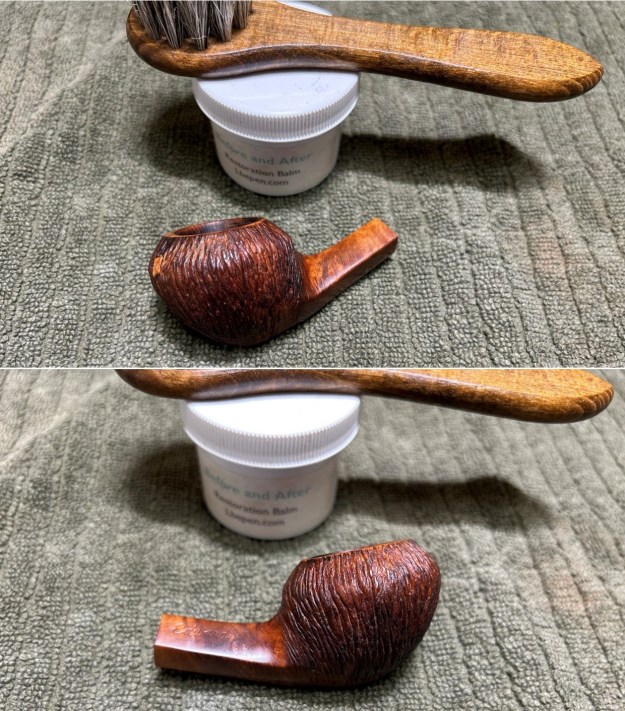 Similar to the stem, I then cleaned the stummel with both pipe cleaners and cotton swabs dipped in lemon-infused 99% isopropyl alcohol.I then decided to ‘de-ghost’ the pipe – that is to say, exorcize the remaining filth from the briar. I filled the bowl and the shank with cotton balls, then saturated them with 99% isopropyl alcohol. I let the stummel sit overnight. This caused the remaining oils, tars and smells to leach out into the cotton.To tidy up the briar, I wiped down the outside, using a solution of a pH-neutral detergent and some distilled water, with cotton rounds. I also used a toothbrush in the crevices. This did a good job of cleaning any latent dirt on the surface of the briar. The last step of the cleaning process was to scour the inside of the stummel with the same mild detergent and tube brushes. This was the culmination of a lot of hard work in getting the pipe clean.I used all nine micromesh pads (1,500 through 12,000 grit) to sand only the smooth (non-rusticated) parts of the stummel and finish it off. This sanding minimizes flaws in the briar and provides a beautiful smoothness to the wood. I rubbed some LBE Before & After Restoration Balm into the briar and let it sit for 30 minutes or so. The balm moisturizes the wood and gives a beautiful depth to the briar. I then buffed the stummel with a microfibre cloth. For the final step, I took the pipe to my bench polisher and carefully buffed it with three coats of conservator’s wax. This procedure makes the pipe look its best – the stummel sings and the stem glows.