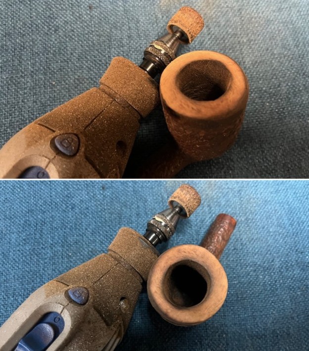 I reamed the bowl and tried to smooth out the walls of the bowl. I started with a PipNet pipe reamer and used the second and third cutting head. I scraped out the remaining cake with a Savinelli Fitsall pipe knife. I sanded the bowl walls with 220 grit sandpaper wrapped around a dowel. I was able smooth out a lot of the damage on the walls.