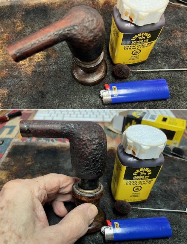 With it clean it was ready to restain the rusticated portion of the bowl and shank. I used a dark brown stain and applied t with a dauber. I flamed it with a Bic lighter to set it in the grain. It certainly looked much better.