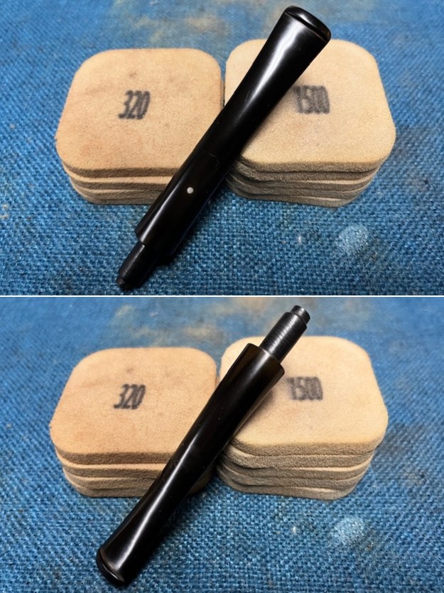 I set the bowl aside and turned my attention to the stem. I sanded the oxidation on the stem with 320-3500 grit 2×2 inch sanding pads. I wiped it down after each sanding pad with a cloth impregnated with Obsidian Oil. The stem began to take on a shine.