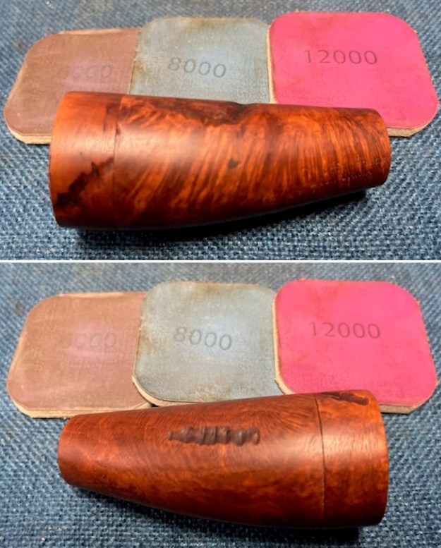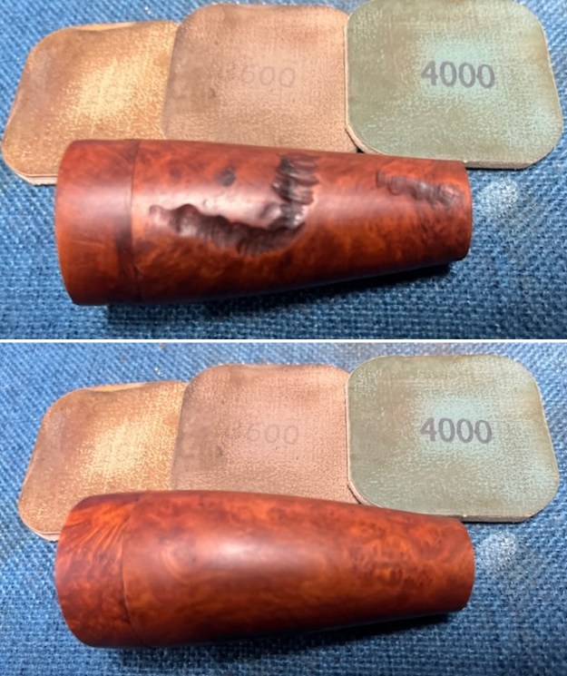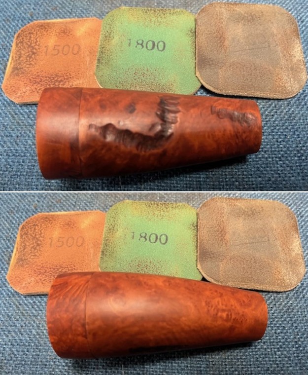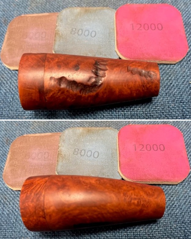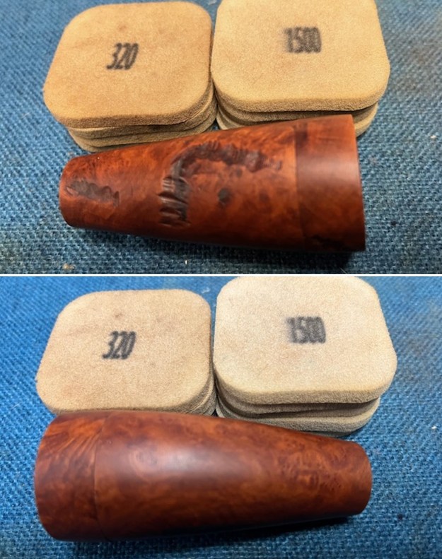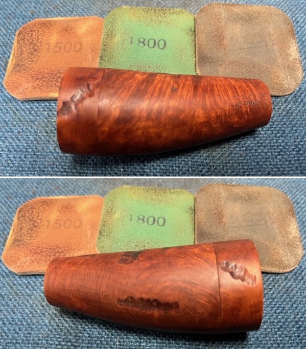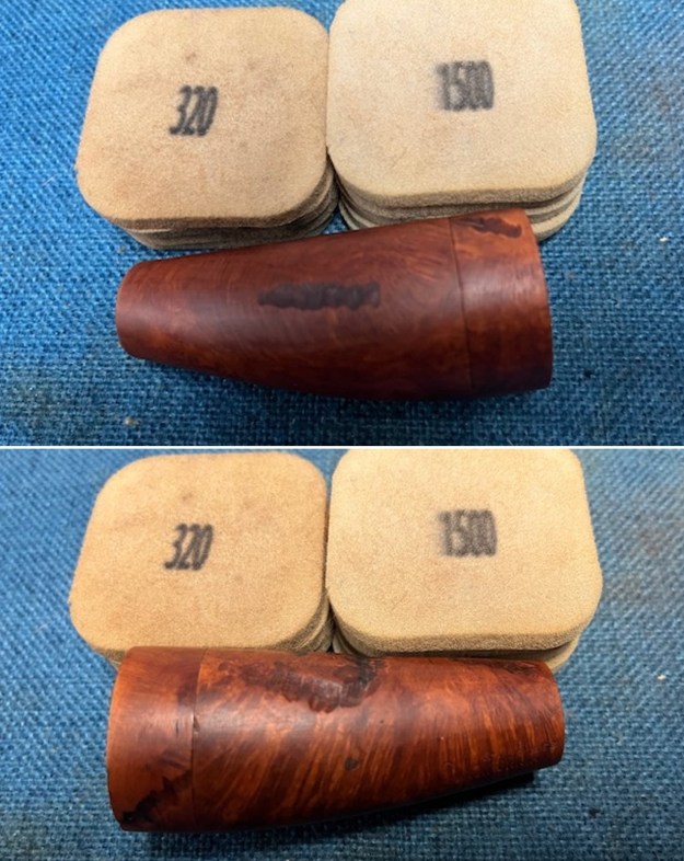 I sanded the briar with 320-3500 grit 2×2 inch sanding pads. I carefully worked around the stamping on the shank side. I wiped it down after each pad with a damp cloth to remove the sanding debris. The sanding blended the black stain on the rustication into the surface and they looked very good.