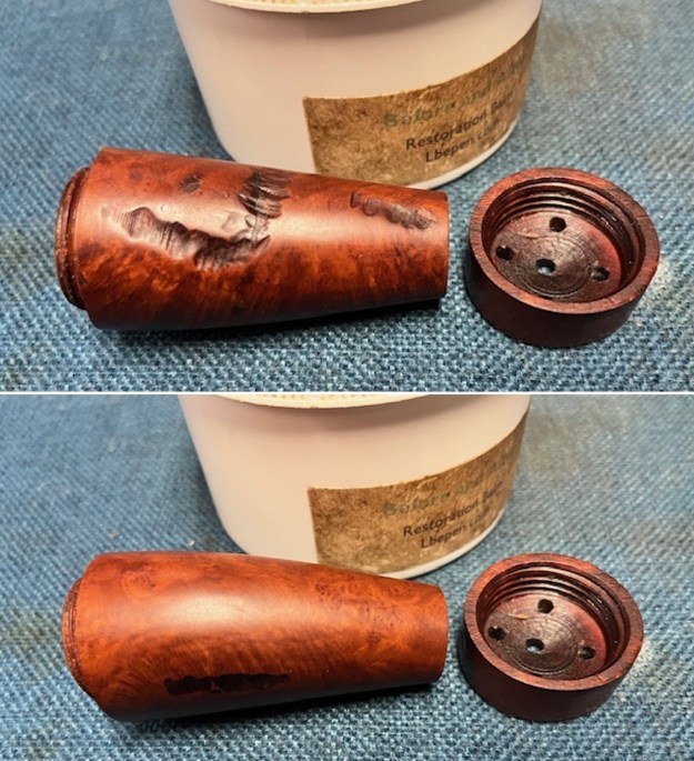 He took a photo of the side of the bowl and cap to show the rustication on the surface of the briar. You can see the putty in the fills on the bowl sides.