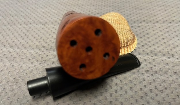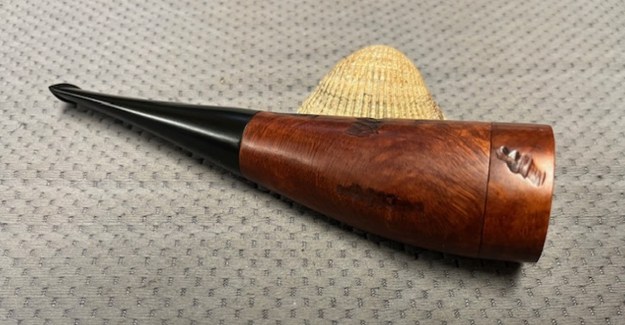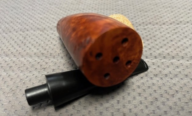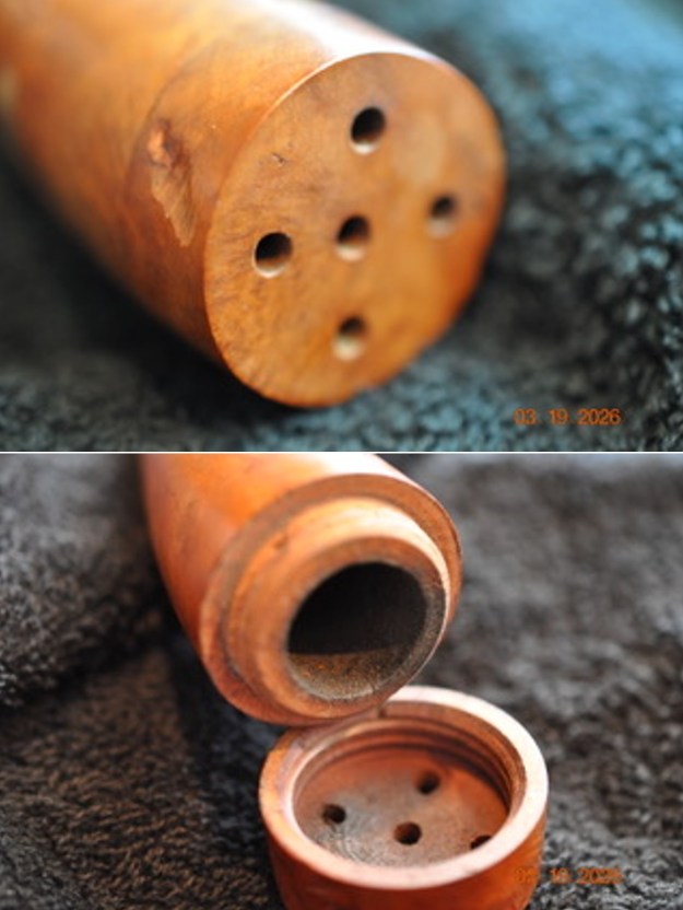 The next pipe I am working on is an interesting Cigar Style or Zeppelin style horn shaped pipe. We picked it up from a seller in Delafield, Wisconsin, USA on 01/28/2026. It has a hard rubber stem and a briar shank/bowl that holds the tobacco and a screw cap on the end with five airholes in the front of the bowl. The finish is smooth with rusticated patches around the bowl and the screw lid on the end. The rustication is similar to what I have found on Custom-bilt pipes. This one had a lot of fills in the rusticated areas. These areas were darker in colour than the smooth finish. The shank end cover unscrews from the wooden threads on the bowl. The pipe is stamped on the left side of the bowl and reads Sequoia House {over] California. The bowl had a light cake in it and some darkening on the inside of the cover and bowl internals.