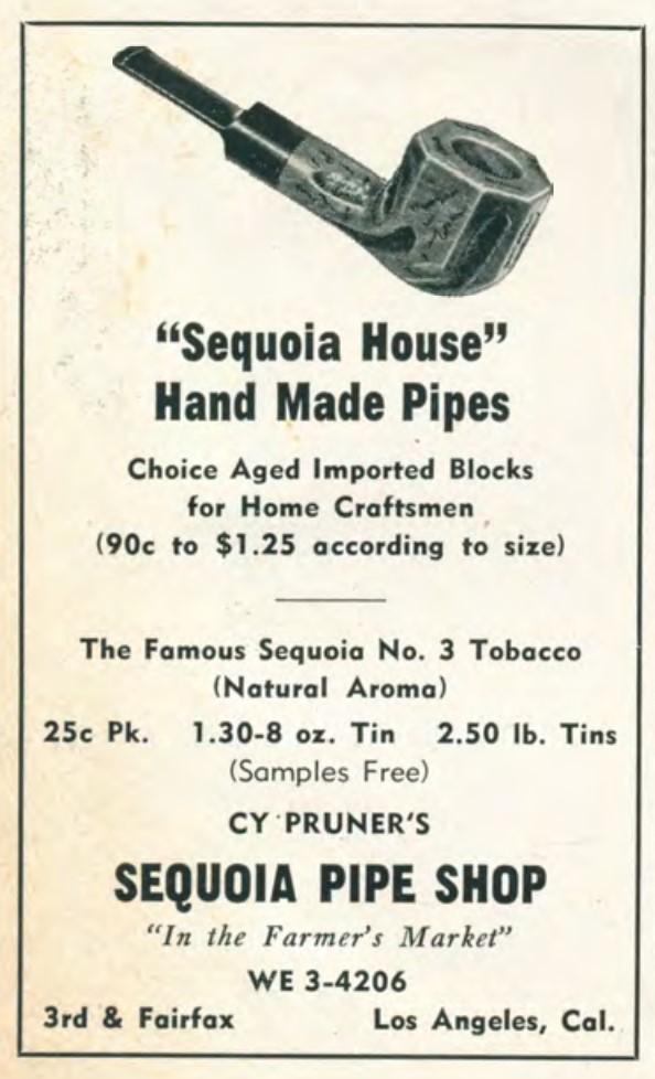 smoking pipes were made by Cy Pruner, who operated Cy Pruner’s Sequoia Pipe Shop in Los Angeles, California.