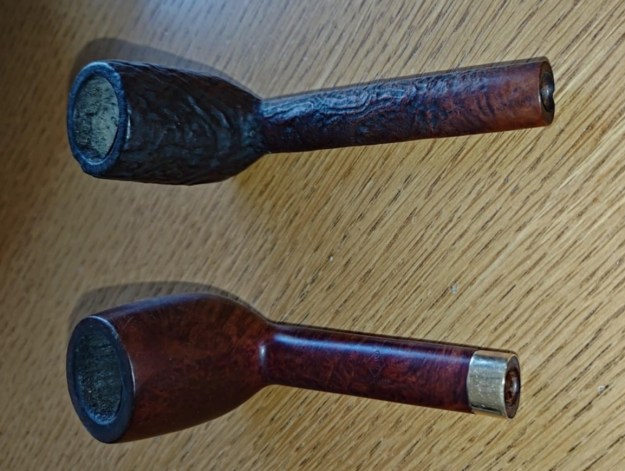 I received the box yesterday. When I opened it this morning I was amazed to see what he had sent. The Sandblast Canadian that needed restemming was stamped 264 Peterson’s Kapruf. The rest of the stamping was quite faint. The pipe needed to be restemmed and it had a small divot in the shank end and what looked like a crack. The second, a smooth Canadian was a BBB Ultonia 504 with a gold band. The two Sandblast with broken stems turned out to be Stanwells. The larger on is stamped Stanwell [over] Regd. No. 969-48. It is followed by the shape number 858 [over] Old Briar. The smaller one is stamped Stanwell [over] Regd. No. 969-48 followed by de Luxe followed by the shape number 87. The last of the five with the cracked bowl is an 8 Dot Sasieni [over] London Made [over] Pat. No. 1513428. It was also stamped “Amesbury”. They were going to be an interesting lot to work on.