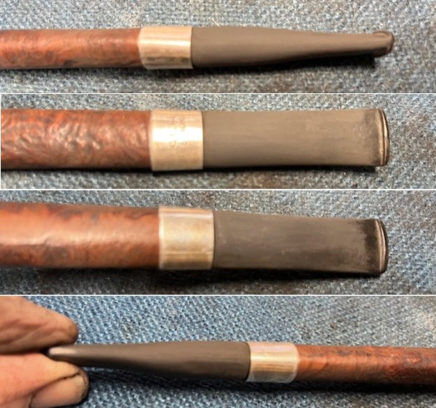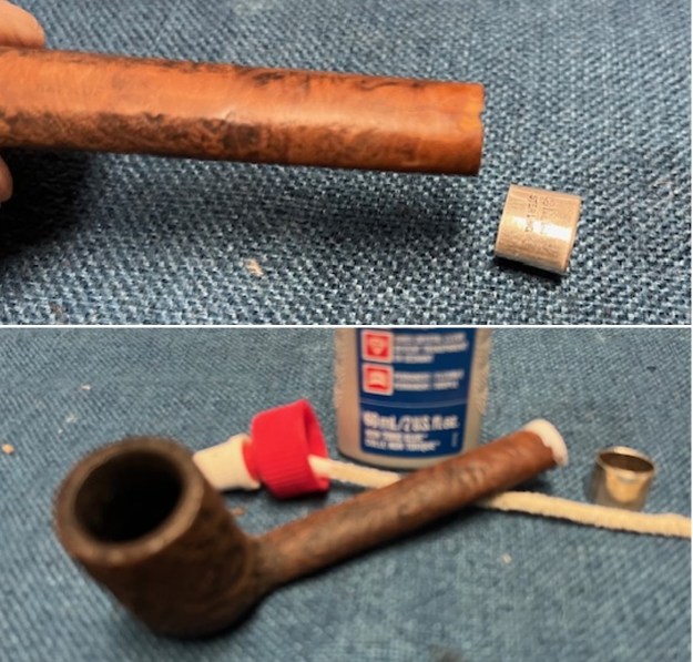I cleaned out the internals of the shank and bowl with pipe cleaners, cotton swabs and isopropyl alcohol. The pipe is very clean. I like it clean to make a better fit for the band and the new stem.