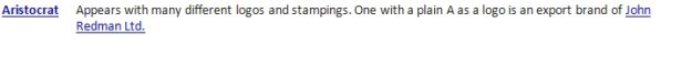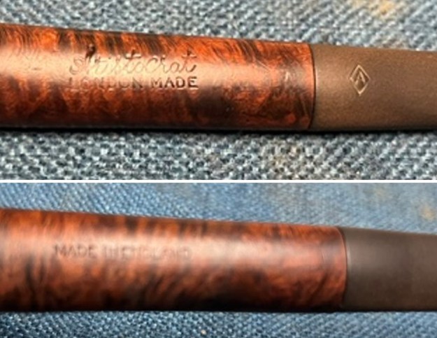 This large, smooth large bowled oval shank Billiard pipe was purchased on 01/20/2026 from a Facebook seller in Quaker Town, Pennsylvania, USA. It really is a beautifully grained large Billiard with a rich smooth finish.  The stem is an oval vulcanite taper stem. The bowl is stained with a contrast of browns that give depth to the grain around the bowl and shank. It is stamped on the topside of the shank and reads Aristocrat in script [over] London Made. On the underside it is stamped Made In England. The bowl had a thick cake with an overflow of lava on the inner bevel and the rim top – heavier toward the back-left side of the bowl. There was grime ground into the finish which left the look quite dull. The taper stem has a Diamond A the topside. It was oxidized and had light tooth marks and chatter on both sides of the stem ahead of the button. Jeff took photos of the pipe before he started his work on it. He took photos of the rim top to show the condition of the top and edges of the bowl. It is dull and has the lava in the rusticated surface of the rim. It is uniquely a beautiful pipe. The stem had oxidation, light tooth marks and chatter on both sides ahead of the button. He took photos of the sides and heel of the bowl to show the finish around the bowl and the condition of the pipe. You can see the grime ground into the surface of the briar. The stain combination really makes the grain stand out. I look forward to seeing it once it is clean and polished. He took photos of the stamping on the sides of the shank. It is clear and readable as noted above. The Diamond A stamp on the top of the stem is also clear and readable.In search of the origins of the Aristocrat, I first look in my autographed copy of Herb Wilczak & Tom Colwell’s, “Who Made That Pipe?” dated 3/3/97.  Tom Colwell’s gifting of this book to “Bruce” is in April of 2001, concluding with his signature.  There were several listings for ‘Aristocrat’ but only two fell within the correct UK parameters: