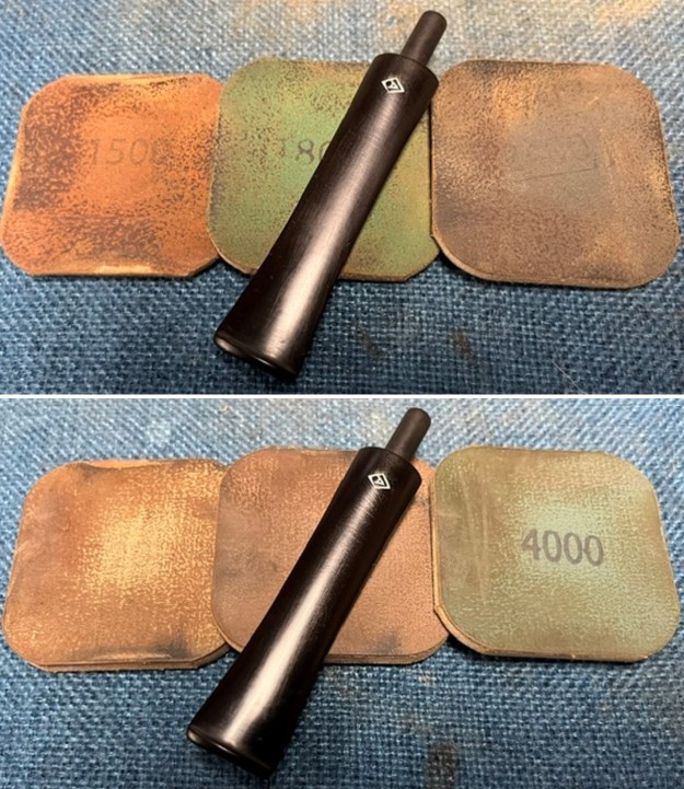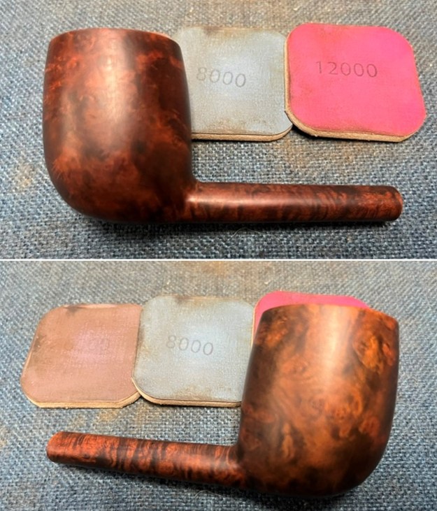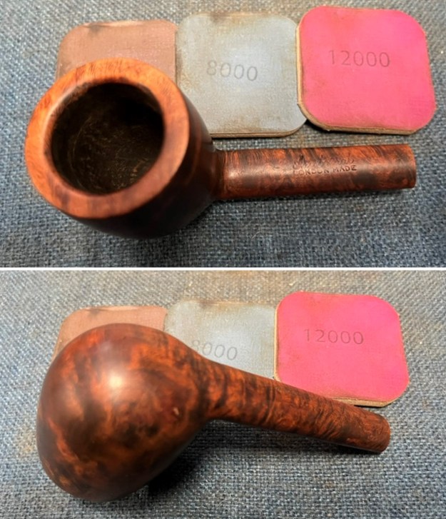Pipephil’s entry solidified the John Redman Ltd. And British Empire Pipe Co., with the Aristocrat and the ‘A’ stem stamping (http://www.pipephil.eu/logos/en/logo-a7.html). The side bar stated that the Aristocrat is an export brand of John Redman Ltd. It was time to work on the pipe. As usual Jeff had done a thorough cleanup on the pipe. He reamed the bowl with a PipNet pipe reamer and a Savinelli Fitsall pipe knife to remove the cake. He scrubbed out the mortise and the airway in the shank and the stem with alcohol, cotton swabs, shank brushes and pipe cleaners. He scrubbed the exterior of the bowl, rim, shank and stem with a tooth brush and Murphy’s Oil Soap to remove the oils and tars on the rim and the grime on the finish of the bowl. He rinsed it under running water. He dried it off with a soft cloth. He soaked the stem in Before & After Deoxidizer and rinsed it off with warm water. He dried it with a soft cloth. The pipe looked good. I took a photo of the rim top and stem to show the condition. The finish on the rim top looked much better and had cleaned up well. The vulcanite stem had some remaining oxidation and some light tooth chatter and marks on both sides ahead of the button edges.The stamping on the top and underside of the shank is clear and readable as noted above. The logo on the top of the stem is clear but needs a touch up of colour. I removed the stem from the shank and took a photo of the pipe to give a sense of the whole. It is a nice-looking rusticated Brandy and should clean up very well. I sanded the bowl with 320-3500 grit 2×2 inch sanding pads to remove the scratching on the sides of the bowl and shank. I wiped the bowl down with a damp cloth after each sanding pad to remove the sanding debris. I polished the briar with 1500-12000 grit micromesh sanding pads to further remove the marks in the finish and to deepen the shine. I wiped it down with a damp cloth after each sanding pad to remove the debris. It looked much better. I worked some Before & After Restoration Balm into the surface of the briar with my finger tips. The product is incredible and the way it brings the grain to the fore is unique. It works to clean, protect and invigorate the wood. I set the bowl aside and turned my attention to the stem. I “painted” the surface of the stem with a lighter flame to lift the tooth marks. It raised them slightly. I filled in what remained with some extra strength Black CA Glue and set it aside to cure. Once it cured I carefully flattened the repairs with 220 grit sandpaper. It looked better. I promptly forgot to take photos of the stem at this point but the photos that follow these show the overall condition of the stem at this point in the process. I touched up the diamond A stamp on the top of the stem with white acrylic fingernail polish. Once it cured it significantly better.I sanded the stem with 320-3500 grit 2×2 inch sanding pads to remove the oxidation and tooth marks. I wiped the stem down after each sanding pads with an Obsidian Oil cloth. It looked much better. I polished the stem with micromesh sanding pads – dry sanding it 1500-12000 pads. I wiped it down with Obsidian after each pad to remove the dust and polishing debris. I polished it with Before After Pipe Polish – both Fine and Extra Fine. I gave it another coat of Obsidian Oil. This richly finished, large bowled Aristocrat London Made Oval Shank Billiard with an oval vulcanite taper stem is in great condition. The briar is clean and really came alive. The rich brown stains gave the grain a sense of depth with the polishing and waxing. I put the stem back on the bowl and carefully buffed the pipe with Blue Diamond on the buffing wheel using a light touch on the briar. I gave the bowl and the stem multiple coats of carnauba wax on the buffing wheel. I buffed the pipe with a clean buffing pad to raise the shine. I hand buffed the pipe with a microfiber cloth to deepen the shine. The finished Aristocrat London Made Billiard is a beauty and feels great in the hand and looks very good. Give the finished pipe a look in the photos below. The dimensions of the pipe are Length: 7 inches, Height: 2 inches, Outside diameter of the bowl: 1 ½ inches, Chamber diameter: 1 inch. The weight is 1.83 ounces/53 grams. Thanks for reading this blog and my reflections on the pipe while I worked on it. I will be putting it on the rebornpipes store in the British Pipe Makers Section. If you are interested in adding it to your collection let me know. Thanks for following the blog on this restoration.