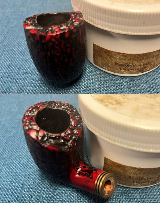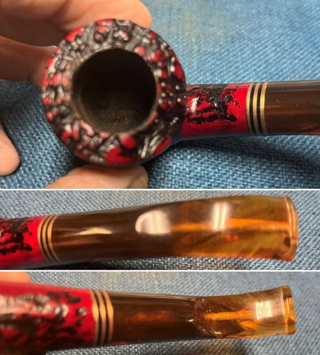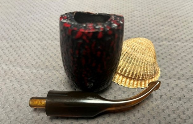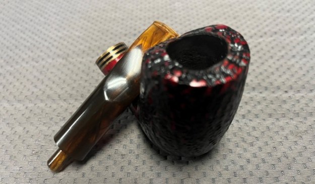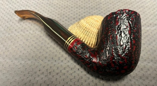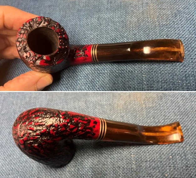 The photo Jeff took of the rim top and bowl shows the cake in the bowl and the lava overflow on the rim top. The shank end has band that is made of three brass bands sandwiching some black acrylic bands that make a great contrast to the reds/black of the bowl. The amber acrylic saddle stem looks very good with the red and black of the stain on the rusticated bowl.