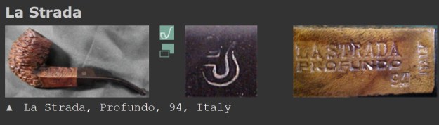The stamping on this one was on the underside of the shank and is shown in the photos below. There was also a shape number 160 is stamped perpendicular to the stem/shank junction. The stamping on both is clear and readable as noted above. The stem also has the La Strada logo stamped on the top side.