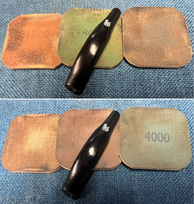 I set the bowl aside and turned to the stem. I touched up the La Strada logo on the stem top with white acrylic fingernail polish. Once it hardened I scraped of the excess and polished it with a 1500 grit micromesh sanding pad. It looked very good.