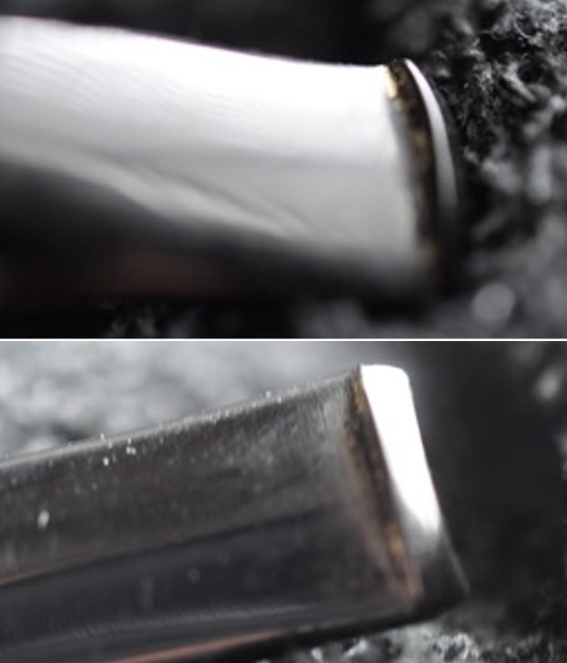 He took photos of the bowl and rim top to show what they looked like before his clean up. You can see the lava coat on the rim top and the cake in the bowl. The inner edge looks to be okay under the thick cake on the walls. He took photos of the stem to show the condition of both sides.