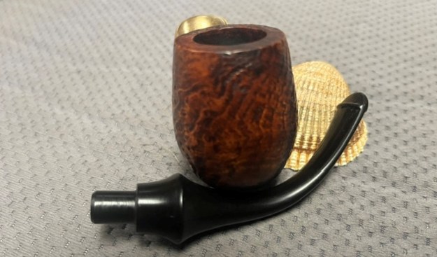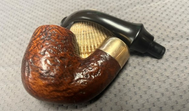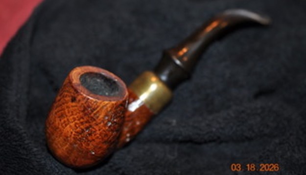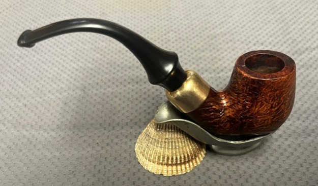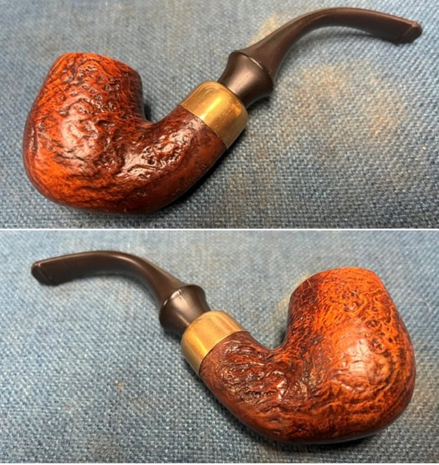 This Sandblast Peterson’s Style Bent Billiard with brass ferrule and a modified Peterson’s stem is a beauty. It was one of a lot purchased on 01/20/2026 from a Facebook seller in Quaker Town, Pennsylvania, USA. It is a Sand Blast Bent Billiard System Pipe with a smooth panel on the underside of the shank. The stem is a fancy vulcanite system style similar to a P-lip but with the airway exiting at the end of the button. The bowl is stained with a contrast of browns that give depth to the blast around the bowl and shank. It is stamped on the smooth panel on the underside of the shank and reads Duncan [over] Mittiken. This second word under Duncan is faint in the middle so I am uncertain of the letters in the middle. Underneath that mystery word it is stamped England [over] the shape number 40. It is definitely Duncan’s version of a Peterson’s System Standard pipe. The shape, the drilling, the ferrule and the stem style are similar. The button on the Peterson’s has the airway on the top while the Duncan has it on the stem end. The bowl had a thick cake and some tobacco debris on the walls. There was an overflow of lava and debris in the inwardly bevelled rusticated finish of the rim top. There was grime ground into the finish which left the bowl and shank dirty and dull. The vulcanite saddle P-lip style stem has light tooth marks and chatter on both sides of the stem ahead of the button. Jeff took photos of the pipe before he started his work on it.