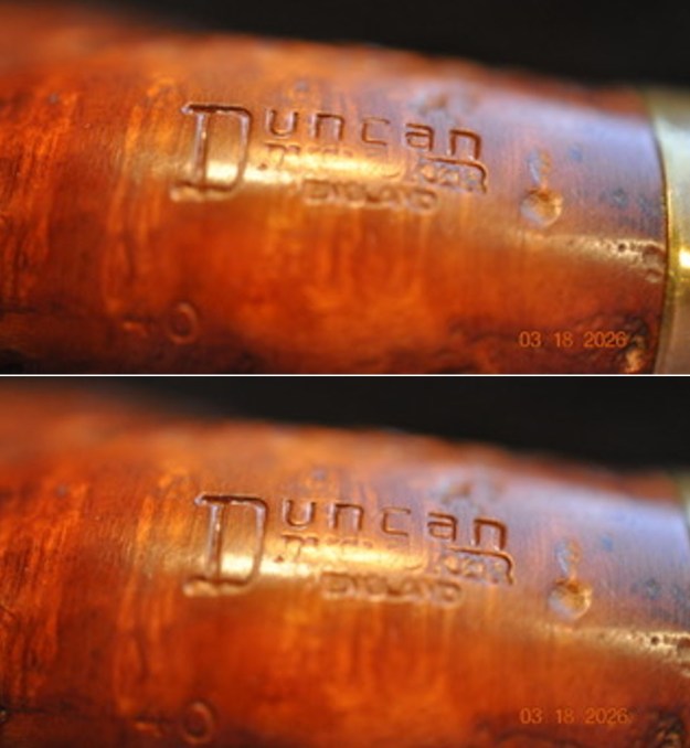 I took a photo of the stamping on the left side of the shank. The top line and two bottom lines are readable. The middle line under Duncan it the mystery. I removed the stem from the shank and took a photo of the pipe to show the look of the pipe.