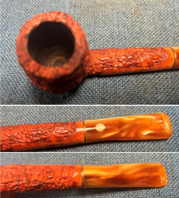 Jeff took photos of the rim top and stem to show the general condition of the pipe. The bowl is heavily caked and there was heavy lava in the rustication on the rim top and inner edge. I am hoping that once the lava is removed the edge will be okay. The stem looked good under the dirt and grime. It had some light tooth marks or chatter. It should cleanup very well.