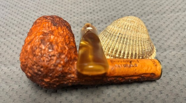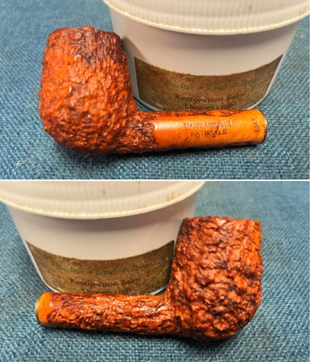 The next pipe on the table is a great looking heavily rusticated saddle stem Billiard. It was one purchased on 01/20/2026 from a Facebook seller in Quaker Town, Pennsylvania, USA. The bowl and the shank are deeply rusticated with deep coral like finish that still shows the colours of the briar beneath. The top of the bowl continues the rustication and is also very tactile. There is a thin brass band on the shank end between the acrylic stem and the briar. It is a great looking pipe. It is stamped on a smooth panel on the left side of the shank and reads Mauro Armellini [over] Naturale. Next to the shank end and brass band it is stamped Italy. The finish was dirty and had a lot of grime and oils ground into the rustication. The brass band is very loose. The rim top and inner edge of the bowl is dirty with a lava flow on the edge and the top that was heavier toward the back of the bowl. There is a thick cake in the bowl. The variegate gold acrylic saddle stem is dirty and has light tooth marks and chatter on the surface on both sides ahead of the button. On the top of the stem is that Armellini white dot in a brass circle logo. Jeff took photos of the pipe before he started his clean up work. It showed a lot of promise.