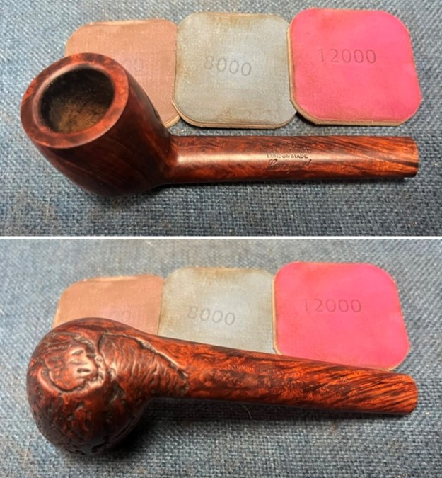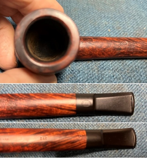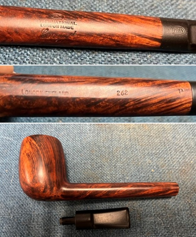 International – France and England made: medium brown smooth, carved top rim, rim stained black. In addition to the pipe line and shape information stamped on the pipe, GBD also had codes for plus sized pipes. These codes in ascending order of size were Conquest, Collector, Colossus.
