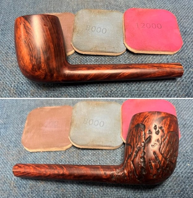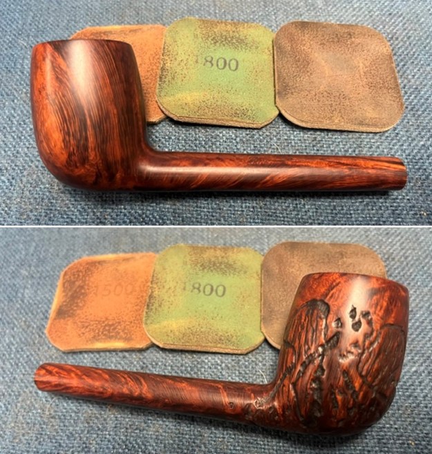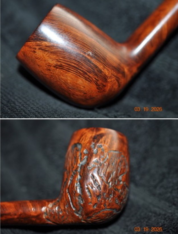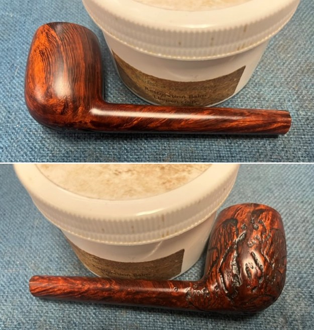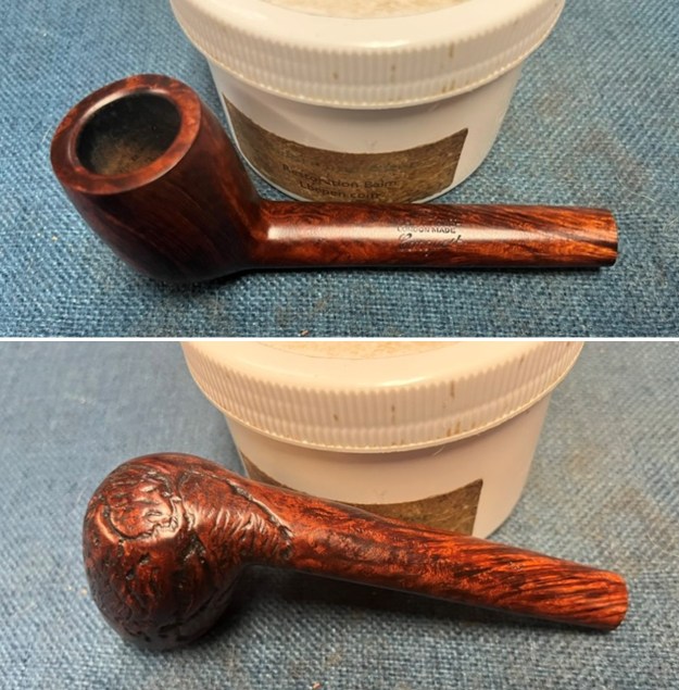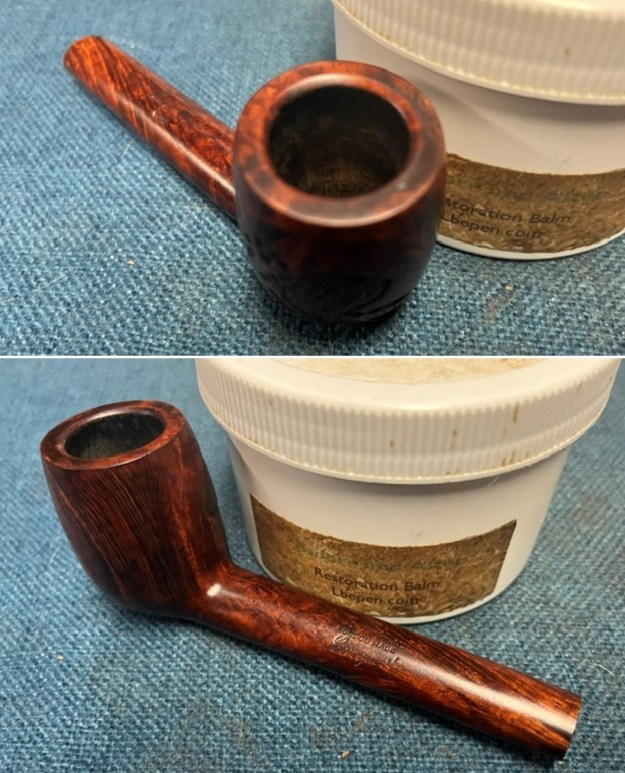 I followed another link on Pipedia to help me understand the various shapes of the Canadians (https://pipedia.org/wiki/File:Lpool.gif). I have included the information below. It is a shape chart with descriptions of the various Canadian off takes. It fits my description of the Lumberman shape above.With all that information it was time to work on the pipe itself. Jeff had done an amazing cleanup of the pipe. He reamed the cake with a PipNet reamer and cleaned up that with a Savinelli Fitsall Pipe Knife. He scrubbed the internals of the bowl and stem with alcohol, cotton swabs, pipe cleaners and shank brushes. He scrubbed the externals with undiluted Murphy’s Oil Soap and rinsed the bowl off with running water. He was able to remove the lava on the rim top and edges and the grime from the bowl. He scrubbed the stem with Soft Scrub to remove the calcification and then soaked it in Briarville’s Pipe Stem Deoxidizer. He rinsed it off with warm water to remove the debris and the product that remained. The pipe looked better when I received it. I took photos of the pipe before I started my work on it. I took a photo of the rim top to show the condition. It looks good with the tars and oils removed from the rim top. The condition of the bowl and rim top were very good. The vulcanite stem looked much better with some light chatter on the top and underside ahead of the button.I took photos of the top and underside of the shank to show the stamping. The stamping is clear and reads as noted above. It was hard to capture in the photos. I removed the stem from the shank and took photo to show the overall look of the pipe.I polished the briar on the bowl and shank with micromesh sanding pads – dry sanding it with 1500-12000 grit sanding pads. I wiped the briar down after each pad with a damp cloth to remove the sanding dust. I rubbed the bowl and shank down with Before & After Restoration Balm. I worked it into the surface of the briar with my fingertips to clean, enliven and protect it. I let the balm sit for a little while and then buffed with a cotton cloth to raise the shine. Mark Hoover’s Balm is a product that I have come to appreciate and one I use on every pipe I have been working on. I set the bowl aside and worked on the stem. I touched up the GBD oval logo stamp on the topside of the saddle stem with Antique Gold, Rub’n Buff. I worked it into the light stamp with a tooth pick. I buffed it off with a soft cloth to remove the excess material. I polished it with a soft cloth. It looked good. I sanded it with 320-1500 grit 2×2 inch sanding pads. I dry sanded and after each pad wiped the stem down with a cloth impregnated with Obsidian Oil. By the final pad the stem looked very good.I polished the stem with micromesh sanding pads – wet sanding it with 1500-12000 grit pads. I polished it further with Before & After Pipe Stem Polish – both fine and extra fine. I finished by wiping it down with Obsidian Oil and buffing it to a shine. I always look forward to this part of the restoration when all the pieces are put back together. I put the GBD International London Made Conquest 262 Lumberman back together and carefully buffed the bowl and stem with Blue Diamond on the buffing wheel. I gave the bowl and the stem multiple coats of carnauba wax. I hand buffed the pipe with a soft cloth to raise the shine. It is fun to see what the polished bowl looks like with the new black vulcanite saddle stem almost glowing. This GBD International London Made Conquest Lumberman is nice looking and feels great in my hand. It is one that could be clenched and smoked while doing other things as it is very light weight and well balanced. It must have been a fine smoking pipe judging from the condition it was when I received it. Have a look at it in the photos below. The dimensions are Length: 6 ½ inches, Height: 1 ¾ inches, Outside diameter of the bowl: 1 ¼ inches, Chamber diameter: ¾ of an inch. The weight of the pipe is 1.45 ounces/41 grams. I will be putting it in the English Pipemakers Section of the rebornpipes store soon. This will make a great addition to someone’s pipe collection. Thanks to each of you who are reading this blog. Remember we are not pipe owners; we are pipemen and women who hold our pipes in trust until they pass on into the trust of the next pipeman or woman.