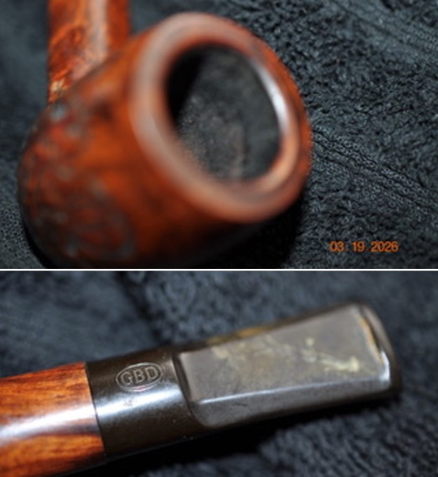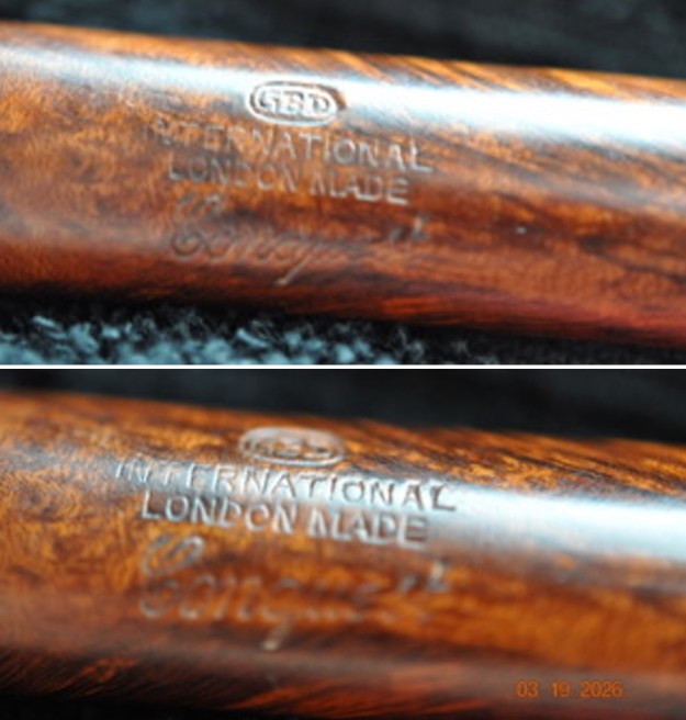 This darker mixed finish, beautifully grained oval shank, saddle stem was purchased on 01/20/2026 from a Facebook seller in Quaker Town, Pennsylvania, USA. It is a great looking Liverpool with a dark, smooth finish on most of the bowl and shank and a bit of rustication on the right side and bottom of the bowl. The stem is a vulcanite saddle stem. The bowl is stained with a contrast of blacks and browns that highlight the grain around the bowl and shank. It is stamped on the top side of the shank and reads GBD in an oval [over] International [over] London Made [over] Conquest. On the underside of the shank it is stamped London, England with an upper-case P near the shank end. The bowl had a thick cake and some tobacco debris on the walls. There was an overflow of lava on the rim top that was heavier toward the back of the bowl. There was grime ground into the finish which left the finish looking quite dull. The oval, vulcanite saddle stem has a GBD oval logo on the topside. There was some light oxidation on the surface and some light tooth marks and chatter on both sides of the stem ahead of the button. Jeff took photos of the pipe before he started his work on it.   He took photos of the pipe’s bowl and rim top to show the cake in the bowl and the spotty lava overflowing onto the top and over the edges. The short saddle stem is oxidized, calcified and has some light tooth marks and chatter on both sides ahead of the button. It is another dirty pipe. He took photos of the sides and the heel of the bowl to give a sense of the condition of the pipe and the interesting grain around the sides and heel. The photos of the right side and heel of the bowl show the unique rustication present on those areas. It really is a beautiful pipe bowl. Jeff took photos of the stamping on the top and underside of the shank and it is clear and readable as noted above. He also captured the GBD oval logo on the saddle stem top. I like to unpack the stamping if I can before I work on a pipe. I knew that the GBD International was a Line of GBD pipes that generally have a rusticated or carved plateau style rim top. They are made in either France or England. The London Made stamp says it is made in England. The International is a unique line that combines black and brown stains. Instead of a carved rim top this one had a carved heel of the bowl and right side of the bowl. The Conquest stamp identifies it as a large pipe. The 262 is the shape number. Now I wanted to see if I could find some more information.