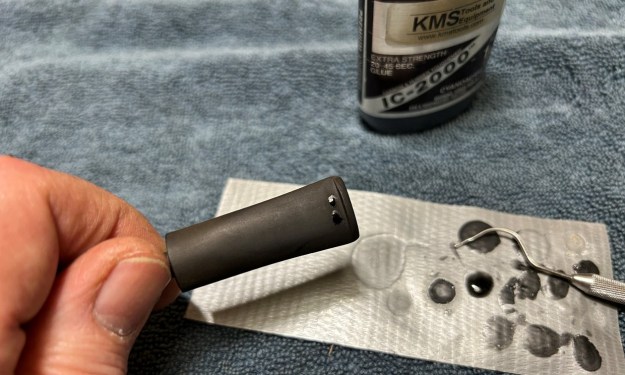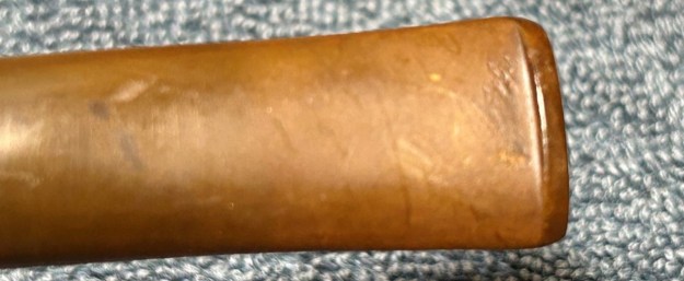 As the stem was now clean and dry, I set about fixing the marks and dents in the vulcanite. This was done by filling those divots with black cyanoacrylate adhesive, impregnated with carbon and rubber. I left this to cure and moved on. After this, I painted the logo on the stem with some enamel nail polish. I restored the logo carefully and let it fully set before proceeding.