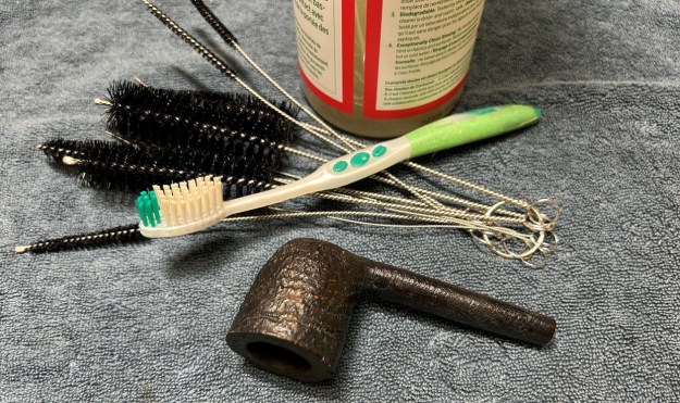 To tidy up the briar, I wiped down the outside, using a solution of a pH-neutral detergent and some distilled water, with cotton rounds. I also used a toothbrush in the crevices. This did a good job of cleaning any latent dirt on the surface of the briar. The last step of the cleaning process was to scour the inside of the stummel with the same mild detergent and tube brushes. This was the culmination of a lot of hard work in getting the pipe clean.