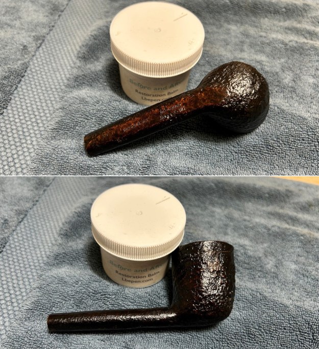 For the final step, I took the pipe to my bench polisher and carefully buffed it – first the stem with a blue diamond compound, then the stummel with three coats of conservators’ wax. This procedure makes the pipe look its best – the stummel sings and the stem glows.
