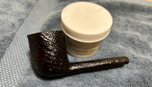 Since the stummel is sandblasted, I only micromeshed the smooth part of the underside on the briar. I rubbed some LBE Before & After Restoration Balm into the briar and let it sit for 30 minutes or so. The balm moisturizes the wood and gives a beautiful depth to the briar. I then buffed the stummel with a microfibre cloth.