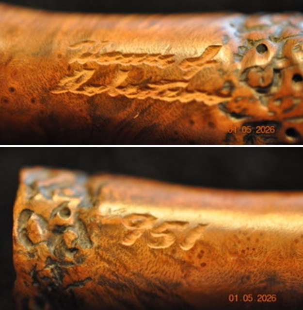 The next pipe on the work table is a change of pace for me. It is a stemless freehand bowl that we purchased off eBay on 11/18/2025 from a seller in Canton, Michigan, USA. It was a great looking Freehand bowl even without the stem. The name House of [over] Robertson is roughly hand-etched on the left side of the shank with an engraving tool. On the right side is etched the number 951 which I assume is a shape number. The pipe is a well shaped Freehand bowl with plateau on the rim top and shank end. It also had some rustication around the shank end and the bottom of the bowl and shank had been slightly flattened. The bowl has some interesting flame grain on it along with a mix of other grains. It is thickly caked with some lava overflow on the plateau rim top. The outer and inner edges of the rim look to be in good condition. The pipe was dirty but underneath all of the grime it appears to be in good condition. It is definitely an interesting pipe and should clean up very well. I will need to fit it with a freehand style stem blank that will complement the shape of the bowl. Jeff took photos of the pipe before he started the cleanup. Jeff took photos show the condition of the bowl and the stem. The photos of the bowl and rim show the cake in the bowl and the heavy lava overflowing onto the plateau rim top. The photos of the sides and heel of the bowl show some stunning and unique grain all around the pipe. The finish makes the grain really stand out on the bowl and shank. The next photos show the etched name on the left side of shank and the shape number on the right side. It is clear and reads as noted above.I am including the information that I found when I received my first of the House of Robertson Pipes. I found a link on Pipedia that gave me the only information I could find on the brand. I include that in total as it is interesting to read.