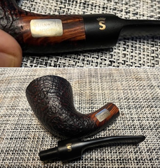 The next pipe I am working on was purchased on 12/13/2022 as part of a group of pipes from a fellow in Copenhagen, Denmark. This was a dirty pipe with a lot of wear and tear and obviously it had been someone’s favourite smoker. The pipe has an identifying plate on the left side of the shank that reads Stanwell [over] 1986. There was no other stamping on the shank and the silver plate confirmed for me that it was a Stanwell Pipe of the Year. The dirty sandblast finish was not able to hide the beauty in the grime. There were tars and oils ground into the surface of the briar. The bowl had a moderate cake that flowed over the top of the lightly crowned rim in a spotty coat of a lava and it was hard to assess the condition of the inner edge. The stem was a black vulcanite saddle stem with a silver Crown S on the left side of the saddle. It had some tooth marks and chatter on both sides ahead of the button. There was also some oxidation and calcification on both sides of the stem. It had a lot of potential. Jeff took photos of the pipes before he started his clean up work.