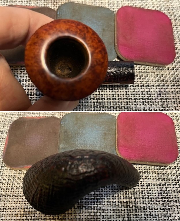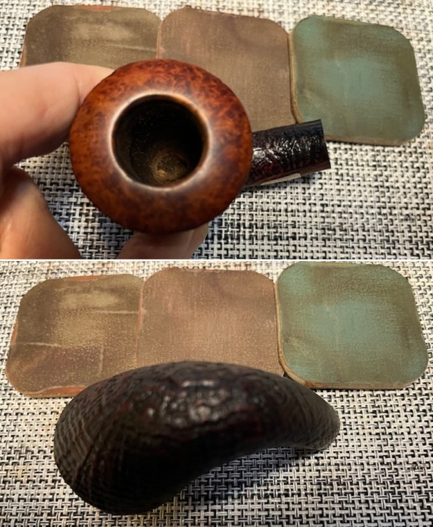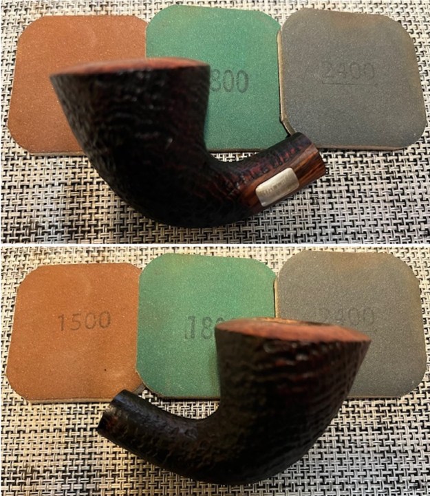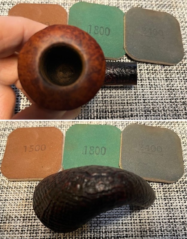 As the photos show, there were some rough scratches on the rim of this pipe. In order to remove them, I “topped” the pipe – that is to say, I gently and evenly sanded down the rim on a piece of 220-grit sandpaper. This effectively removed the damage, without altering the look of the pipe.
