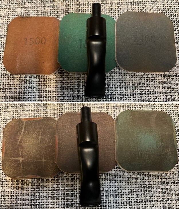Once the repair cured I sanded the surface of the stem and the button with sanding pas. I used 350-3500 grit sanding pads to smooth out the surface and adjust the fit on the shank. The pads work very well and the stem looked much better.