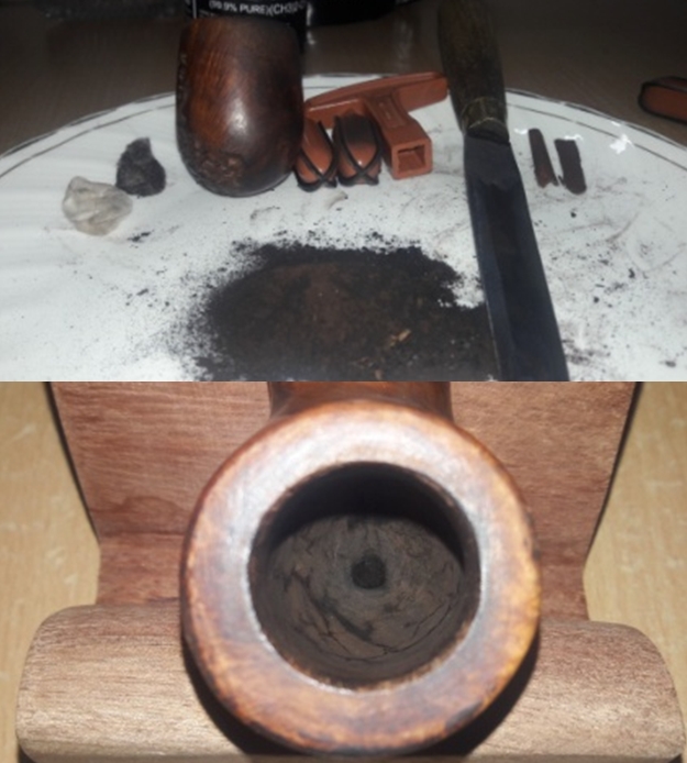 With that information at hand I turned to work on the pipe itself. Jeff had thoroughly cleaned up the pipe. He reamed the pipe with a PipNet Pipe Reamer and cleaned up the remnants with a Savinelli Fitsall Pipe Knife. He scrubbed the bowl with undiluted Murphy’s Oil Soap with a tooth brush. He rinsed it under running warm water to remove the soap and grime. He cleaned out the inside of the shank and the airway in the stem with alcohol, cotton swabs and pipe cleaners. He scrubbed the exterior of the stem with Soft Scrub to remove as much of the oxidation and calcification as possible. He soaked the stem in Briarville’s Pipe Stem Deoxidizer and rinsed it off with warm water. I took photos of the pipe once I started to work on it.