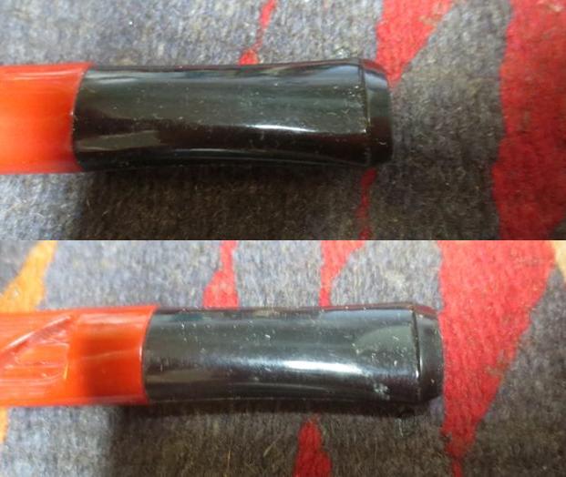 He took photos of the rim top and stem to show the general condition of the pipe. The bowl is moderately caked and the rim top and edges have a spotty lava overflow. The stem looks good but it has light tooth marks on the top and underside near the button.