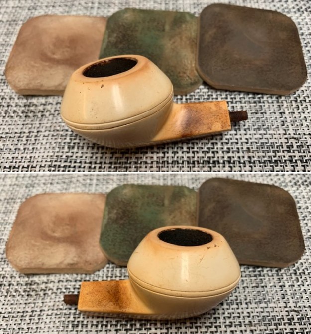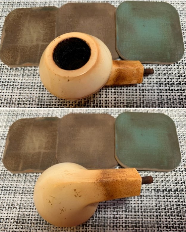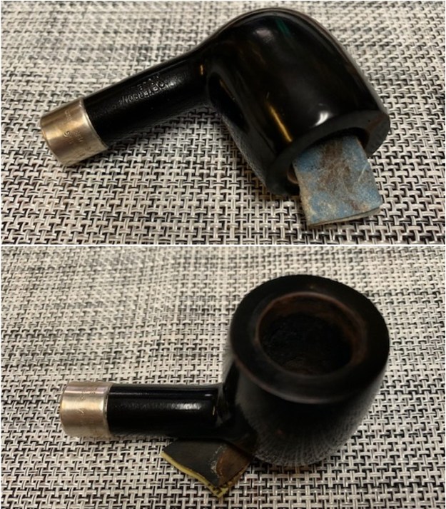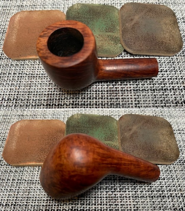 Jeff had thoroughly cleaned up the pipe. He reamed the pipe with a PipNet Pipe Reamer and cleaned up the remnants with a Savinelli Fitsall Pipe Knife. He scrubbed the bowl with undiluted Murphy’s Oil Soap with a tooth brush. He rinsed it under running warm water to remove the soap and grime. He cleaned out the inside of the shank and the airway in the stem with alcohol, cotton swabs and pipe cleaners. He scrubbed the exterior of the stem with Soft Scrub to remove the grime. He soaked the stem in Briarville’s Pipe Stem Deoxidizer and rinsed it off with warm water. The pipe looked very good when it arrived here in Vancouver.