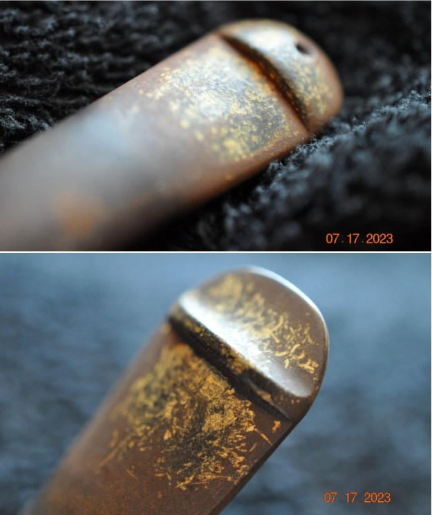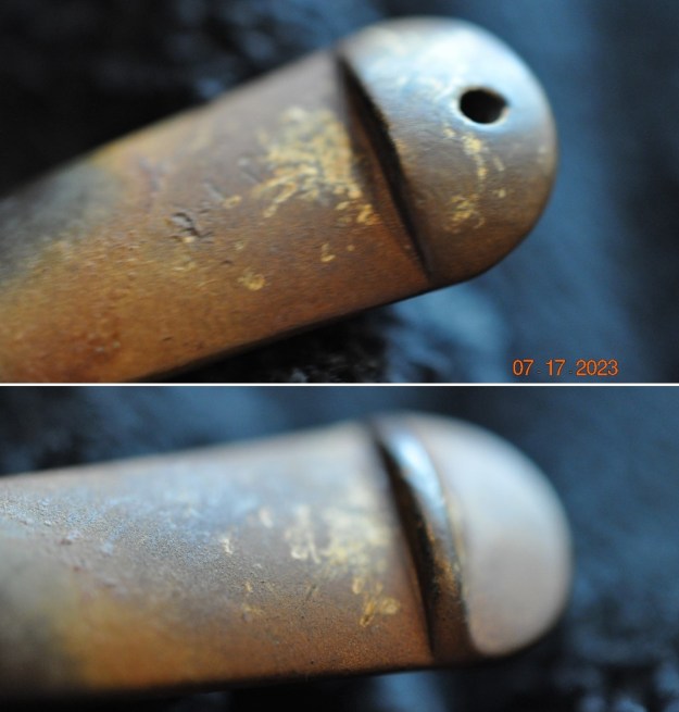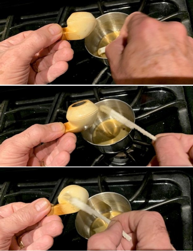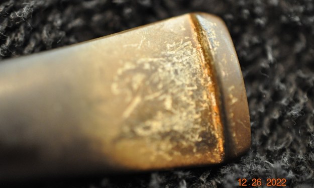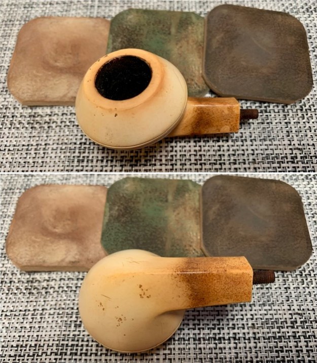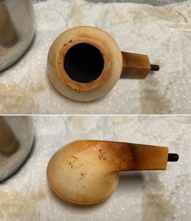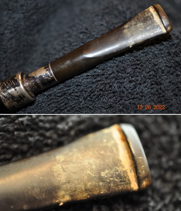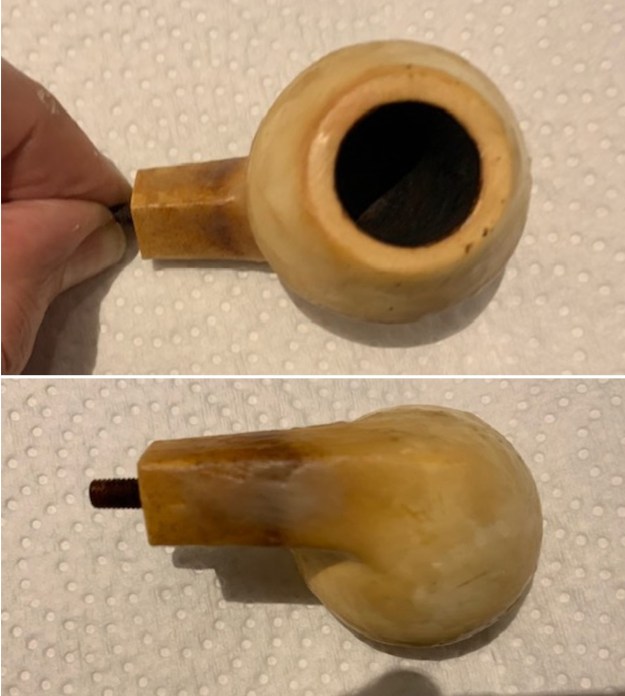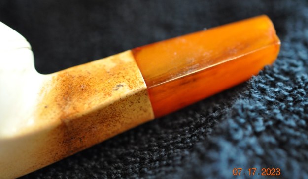 He took photos of the bowl and rim top to show their general condition. You can see the thick cake in the bowl and the thick lava coat on the top of the rim and inner edge of the bowl. The finish on the bowl is very dirty with grime and oils ground into the bowl, but still very stunning. The round saddle stem is dirty and has chatter and deep tooth marks on the top and underside ahead of the button and on the button surface.