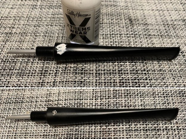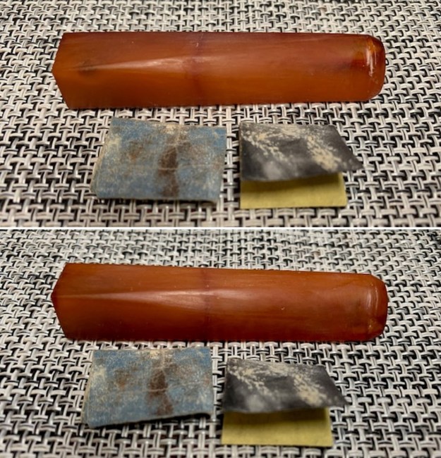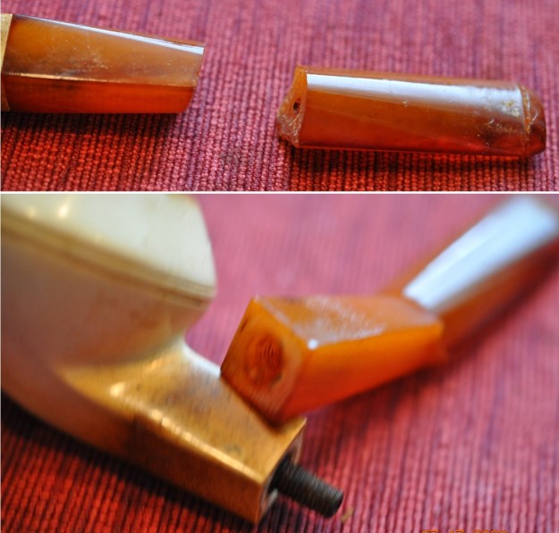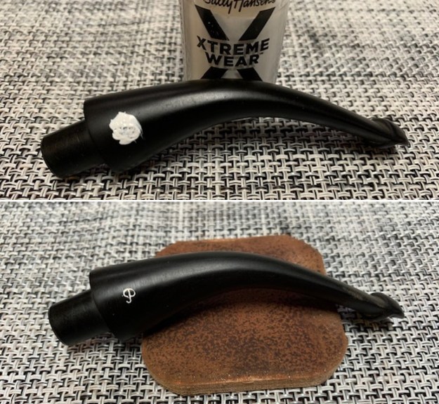 I set the bowl aside and turned my attention to the stem. I filled in the deep marks in the acrylic stem with black rubberized CA glue. Once it hardened I flattened the repairs out with a small file. I sanded the stem with 220 grit sandpaper to blend them into the rest of the acrylic stem and started the polishing them with 600 wet dry sandpaper.