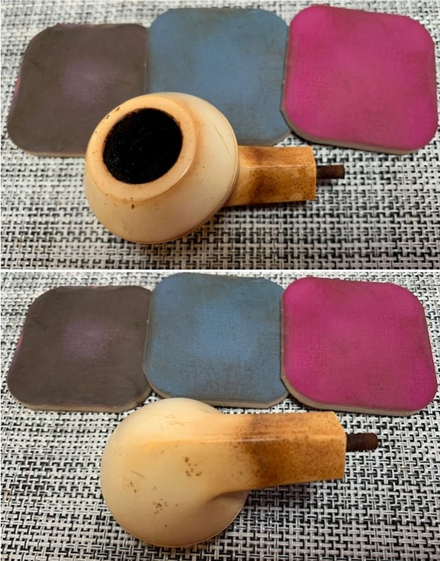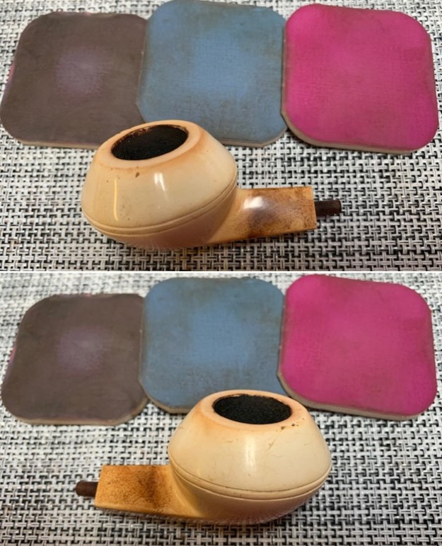 I rubbed the bowl down with Before & After Restoration Balm. I worked it into the surface of the briar with my fingertips and a shoe brush to get it in the grooves. It works to clean, restore and preserve the briar. I let it do its magic for 15 minutes then buffed it off with a cotton cloth. The pipe looks incredibly good at this point in the process.