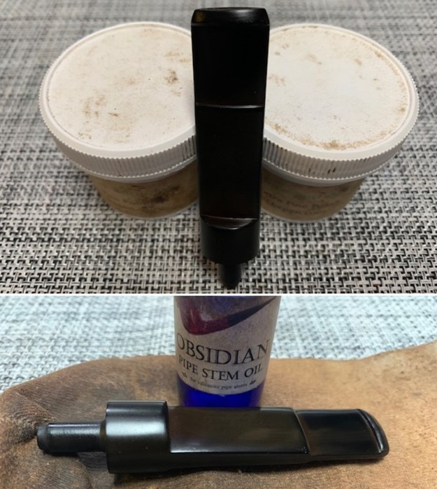 I polished the stem with micromesh sanding pads – 1500-12000 grit sanding pads and water to wet sand the stem. I wiped it down after each sanding pad with Obsidian Oil on a cotton rag after each sanding pads. Many don’t use it on acrylic stems but I find it does two things – first it gives some protection to the stem from oxidation and second it give the sanding pads bite in the polishing process.