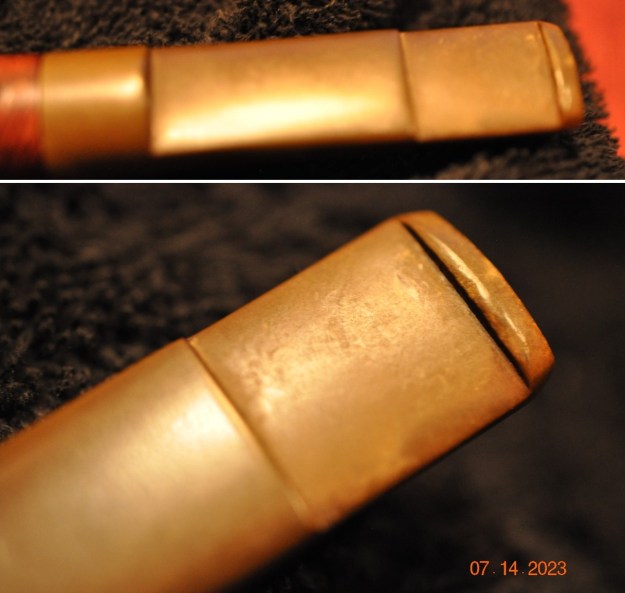 - The acrylic stem is in excellent condition – dirty and has some deep tooth chatter and marks on both sides ahead of button. There is a Caminetto white moustache logo inlaid in the stem top.
