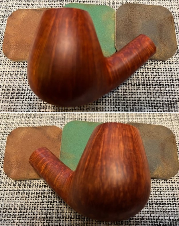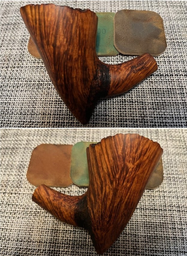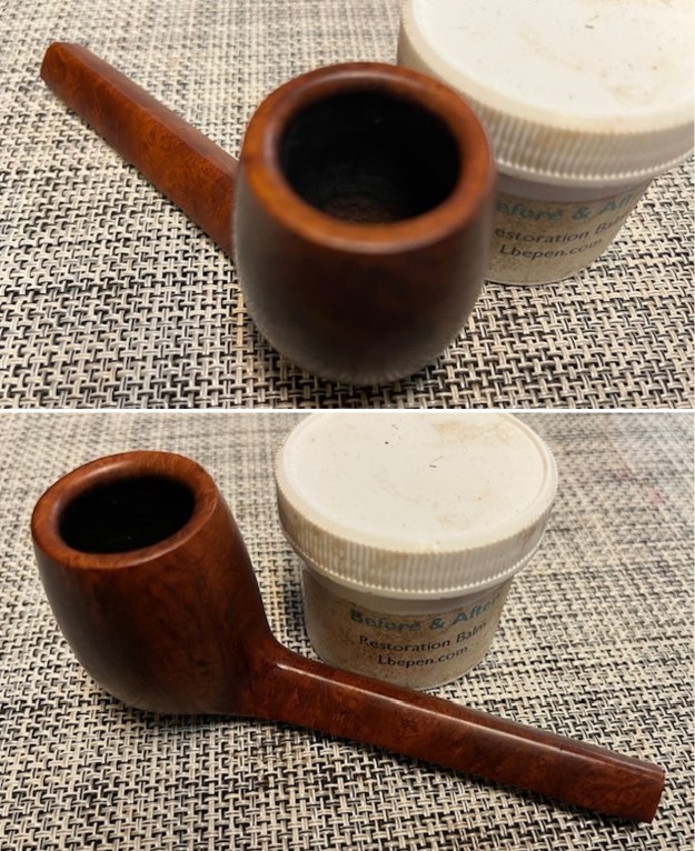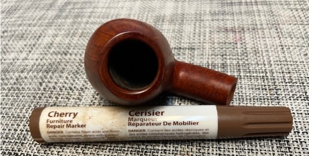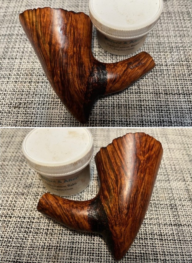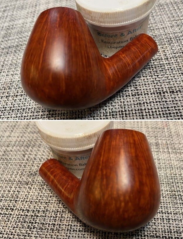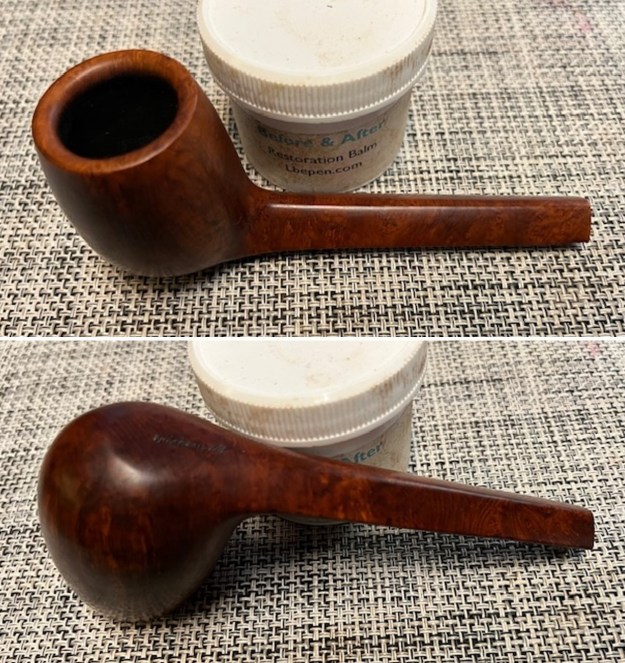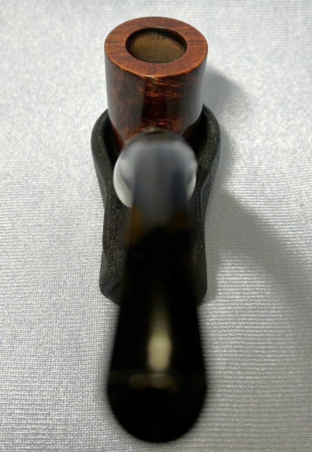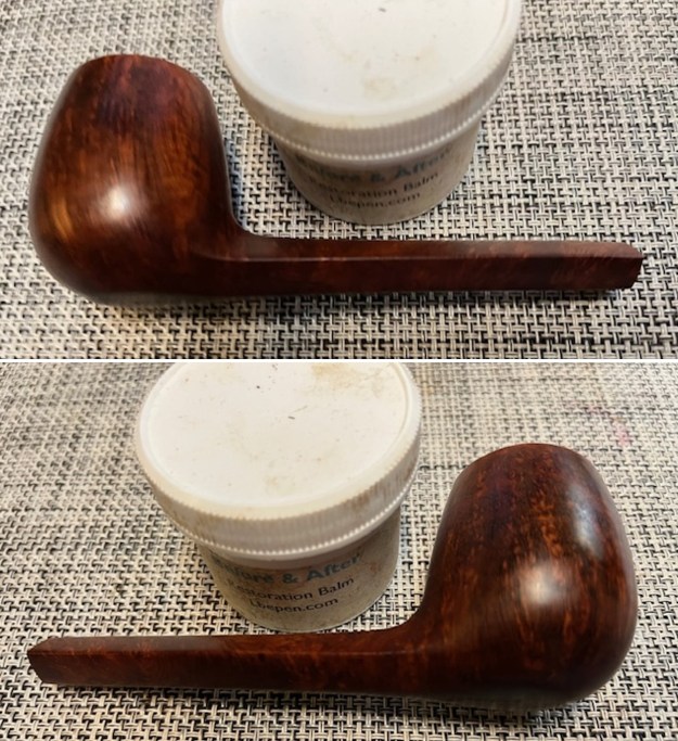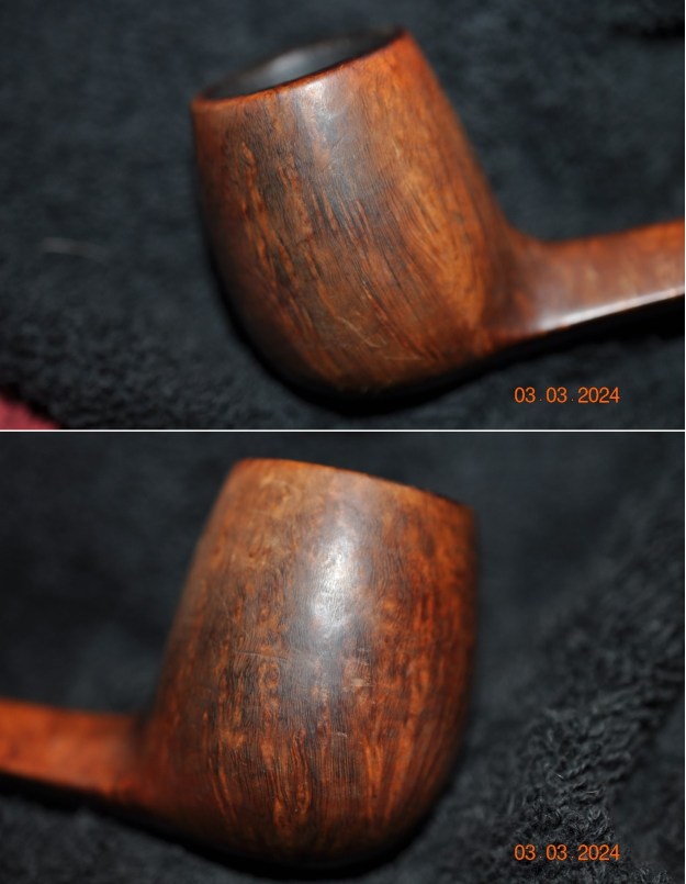 I used a very heavily diluted solution of Feiblings Medium Brown stain to refresh the briar. The bowl was then buffed with White Diamond and several coats of carnuba wax.
