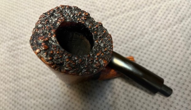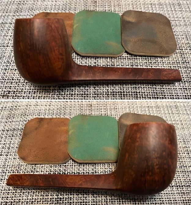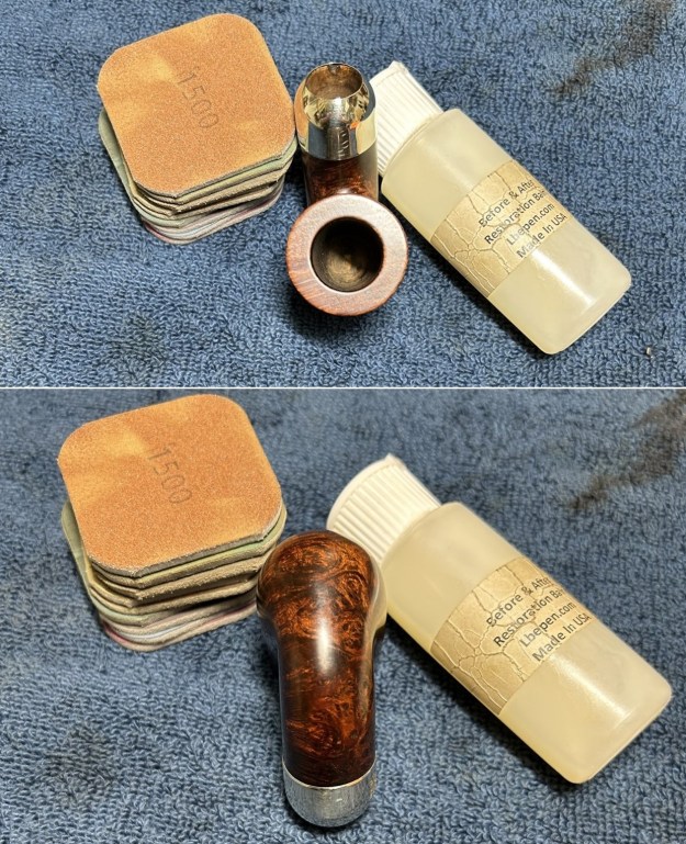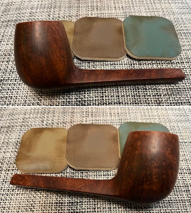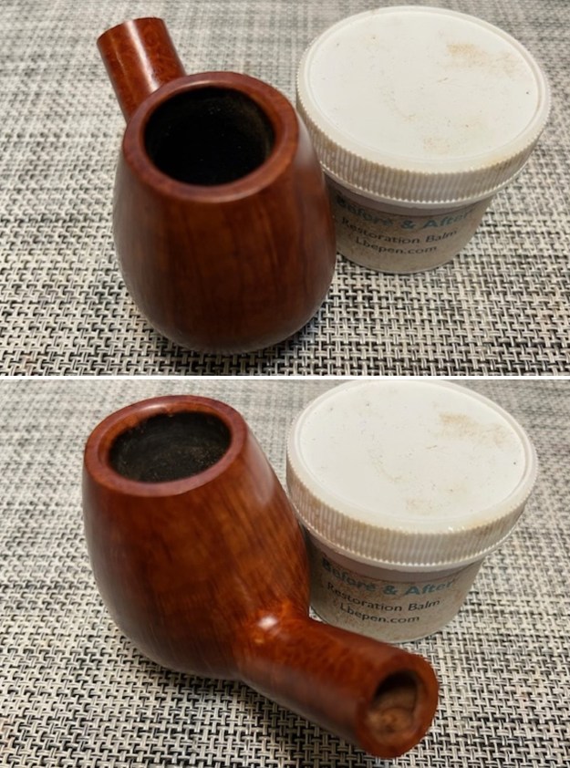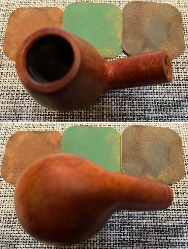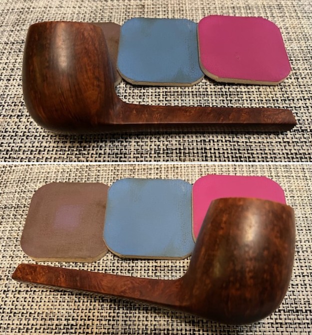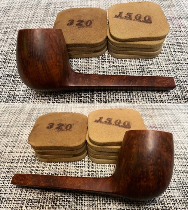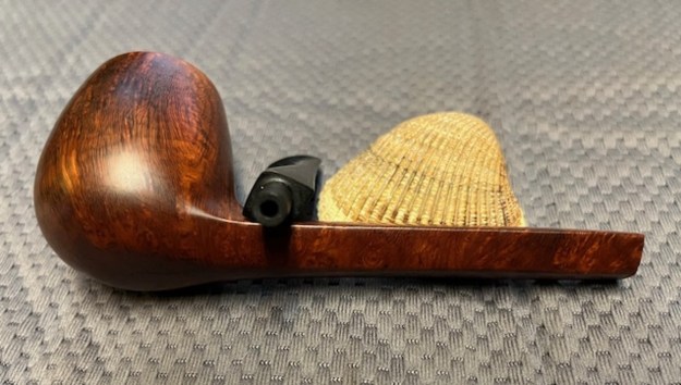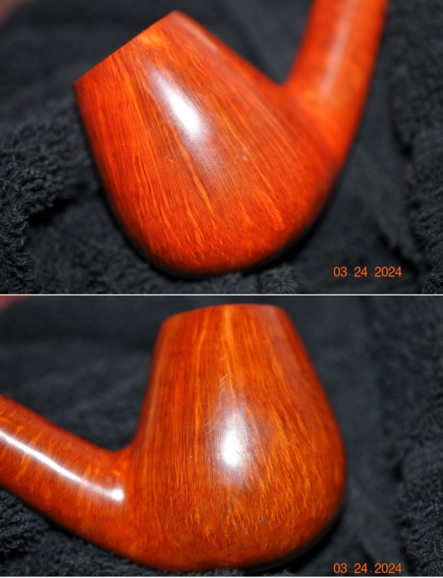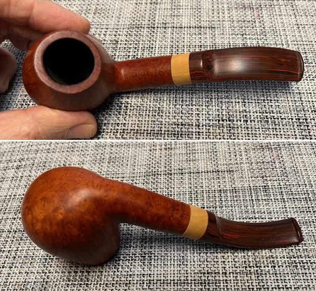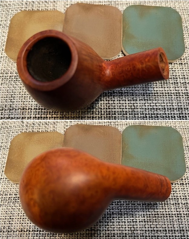 I used a very heavily diluted solution of Feiblings Medium Brown stain to refresh the briar. The bowl was then buffed with White Diamond and several coats of carnuba wax.