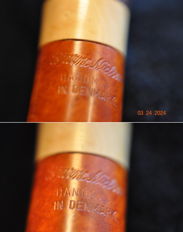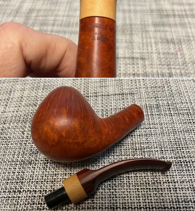 The next pipe on the table is a Freehand with some rustication at the shank/bowl joint and plateau on the rim top.  It has a well shaped thick vulcanite taper stem. We purchased it from an estate sale in Oregon City, Oregon, USA on 03/21/2024. The pipe is stamped on the underside of the shank and reads Bjarne Nielsen [over] Handmade [over] In Denmark [over] C. There is no other stamping on the bowl or shank. There was a thick cake in the bowl and some darkening and lava on the inner edge of the bowl and some spots of lava on the rim top. It was hard to know for certain the condition of the inner edge though it appeared to be in good condition. There were oils and grime ground into the bowl sides gives the finish a flat look though there is some great grain. The shank is thick and has a slight curve to it giving the pipe a Brandy Glass shape. The saddle stem matches the curves of the bowl and shank. It has what looks like a Boxwood band on half of the saddle. The Cumberland stem is a dirty stem and has a rubber Softee Bit on the area ahead of the button. There is calcification, oxidation, grime, grit on the surface and also light tooth marks on both the top and underside of the stem just ahead of the button. Jeff took photos of the pipe before he started his clean up work. I have included them below. He took photos of the pipe’s bowl and rim top to show the cake in the bowl, the darkening on the inner edge and the spotty lava coat overflowing onto the top. It is another dirty pipe. He also took photos of the stem with and without the rubber Softee Bit to capture the oxidation, calcification and the light tooth marks on the top and underside of the stem near the button. He took photos of the sides and heel of the bowl to show the grain around the bowl and the amount of grime ground into the surface of the briar. He took photos of the stamping on the underside of the shank. It is clear and quite readable. It reads as noted above. I have had many Bjarne pipes cross my work table over the years but all had been stamped only Bjarne or Bjarne Handmade. None of them had his full name stamped on it and none had a letter stamp which I assumed indicated the grade of the pipe. I did some research on Pipedia.com and found some helpful information on both the stamping of my pipe and the history of Bjarne Nielsen himself. I am including the link to the full article on Pipedia and also some pertinent sections of the article that I have edited for quick reference. https://pipedia.org/wiki/BjarneFrom the early 1990s Bjarne had seven pipemakers employed and the pipes were sold in no fewer than 32 countries. For more than six months each year, Bjarne travelled around the world to promote his pipes by meeting with dealers and customers. But sadly, it all ended in February 2008 when Bjarne, then 66 years old suffered a fatal heart attack. An unexpected blow fist of all to his family, but also to the pipemakers who had been working for him, and to all lovers of his pipes from around the world. And as no one was willing to take over, the Bjarne pipe died together with its creator.
