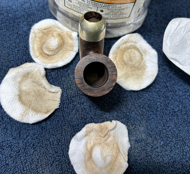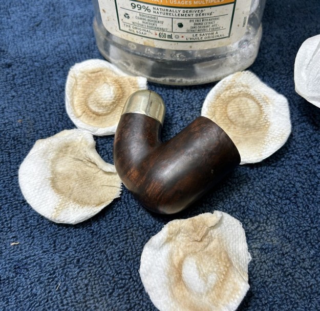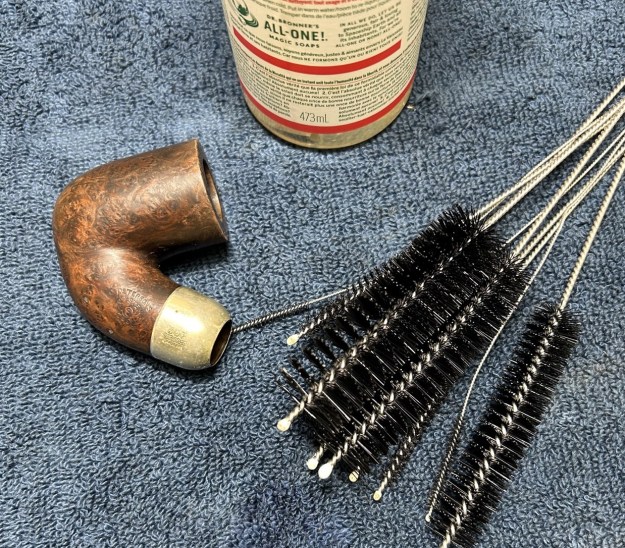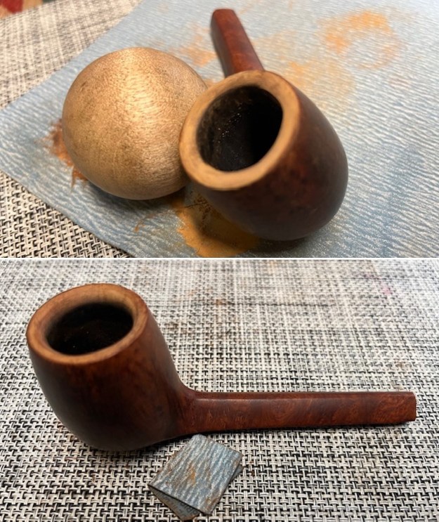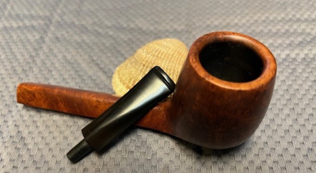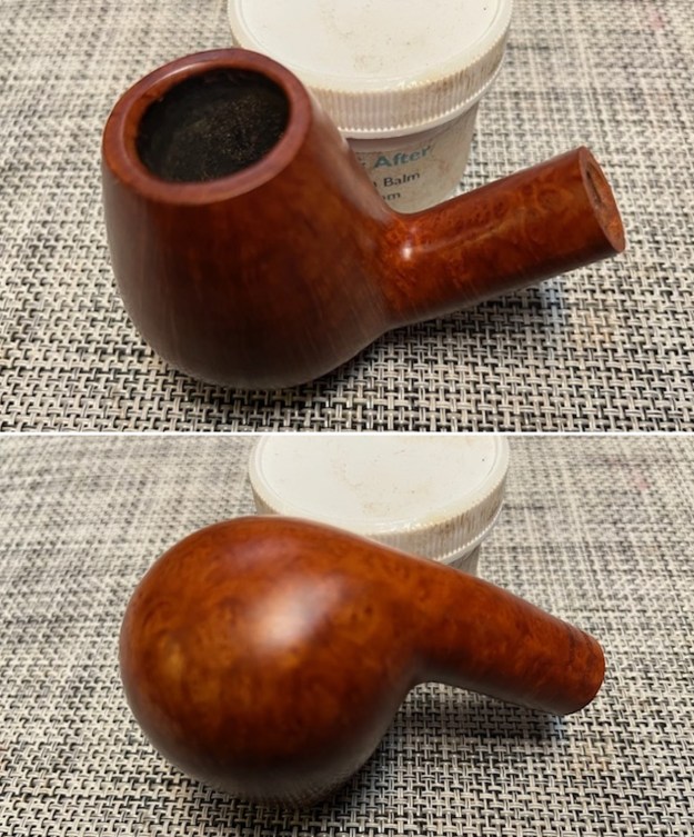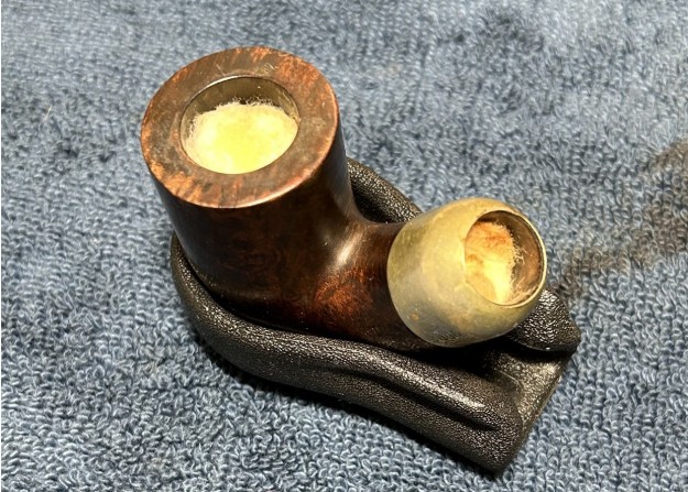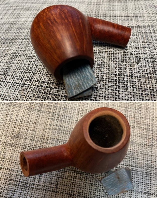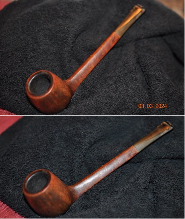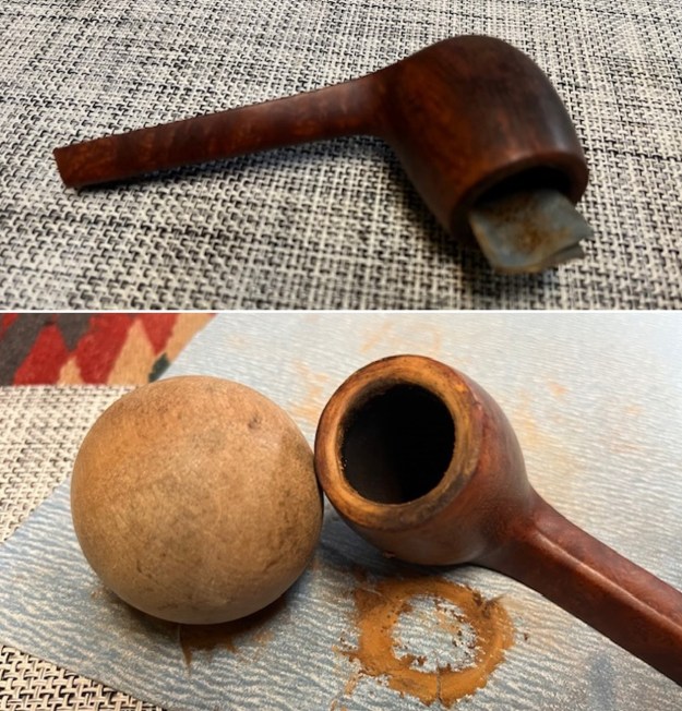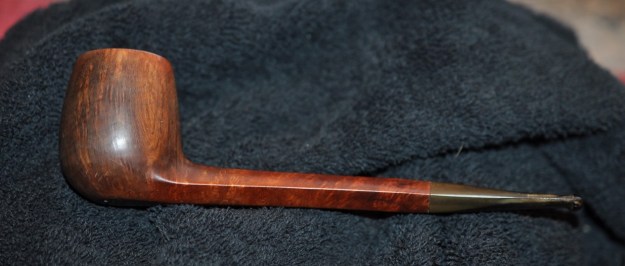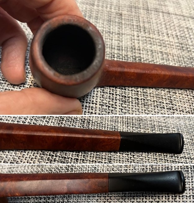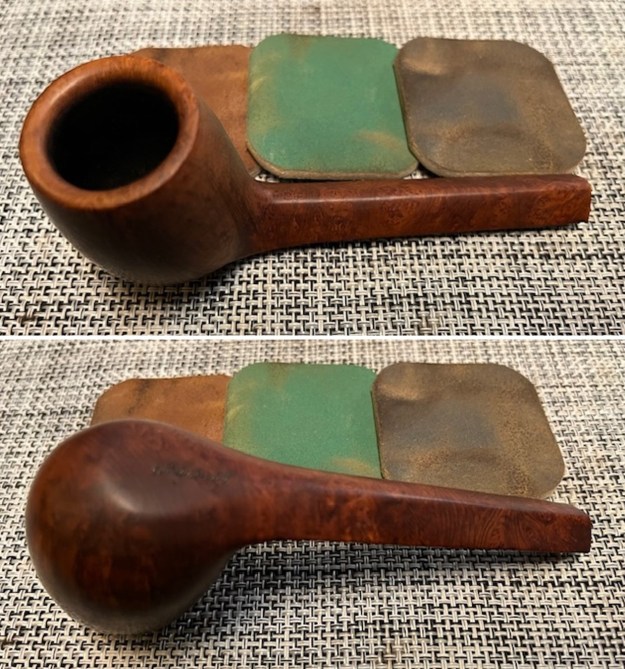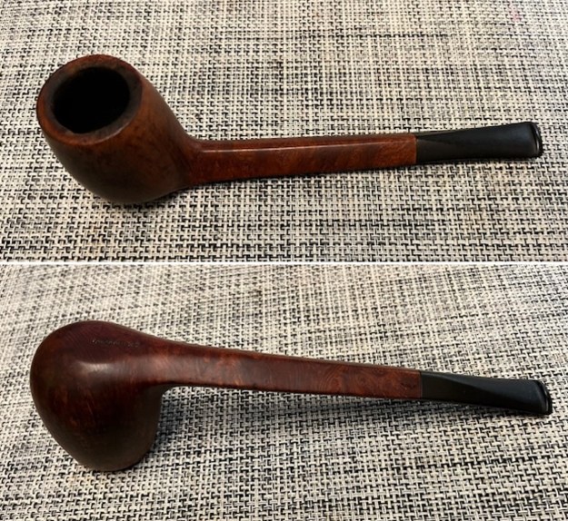 The pipe was in good condition, with some wear on the stem. The bowl appeared to be in very good condition, with only a very slight cake. The stem was “clocked” to the correct line-up. The stain was very faded, and I have a feeling someone removed the factory finish, perhaps starting, but not finishing a restoration. Below is the pipe as it was received.